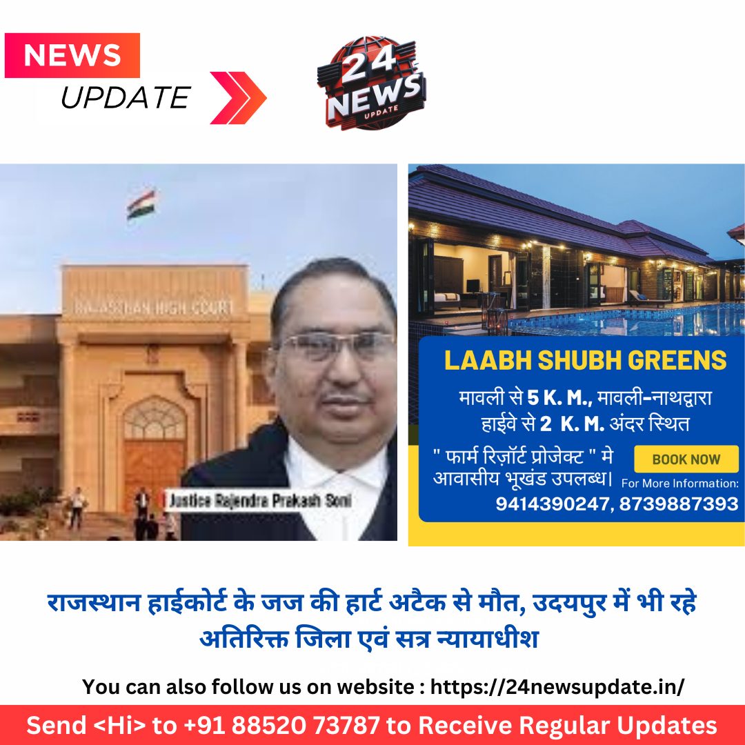24 न्यूज अपडेट. जोधपुर। राजस्थान हाईकोर्ट के जस्टिस राजेंद्र प्रकाश सोनी (56) का कल देर रात हार्ट अटैक से निधन हो गया। कल रात को ही सीने में दर्द व घबराहट के बाद एक निजी अस्पताल में भर्ती करवाया गया था। वहां पर इलाज के दौरान उन्होंने दम तोड़ दिया। जस्टिस राजेंद्र प्रकाश सोनी 16 जनवरी 2023 को राजस्थान हाईकोर्ट के न्यायधीश बने थे। उनके निधन की खबर आत ेही कई जज व एडवोकेट हॉस्पिटल पहुंचे। आज दोपहर में उनका अंतिम संस्कार किया गया। बताया गया कि जज सोनी पाली के जैतारण के रहने वाले थे। राजस्थान न्यायिक सेवा में चयनित होकर करियर की शुरुआत की। पिता रामचंद्र सोनी व्यवसायी और माता परमेश्वरी देवी गृहणी हैं। सोनी ने वरिष्ठ सिविल न्यायाधीश के रूप में भी कार्य किया। वे अजमेर में मुख्य न्यायिक मजिस्ट्रेट भी रहे। वर्ष 2010 में नियमित जिला न्यायाधीश बनने के बाद, भरतपुर, जयपुर शहर, जोधपुर, नाथद्वारा और उदयपुर में अतिरिक्त जिला एवं सत्र न्यायाधीश के रूप में कार्य किया। वे जिला एवं सत्र न्यायाधीश के तौर पर उदयपुर और राजसमंद में मोटर दुर्घटना दावा न्यायाधिकरण के पीठासीन अधिकारी भी रहे। जोधपुर में राजस्थान उच्च न्यायालय की मुख्य पीठ में रजिस्ट्रार (प्रशासन) के रूप में भी पोस्टेड रहे। प्रमोशन से पहले डूंगरपुर, सिरोही, जालोर, उदयपुर और कोटा के प्रधान जिला एवं सत्र न्यायाधीश रहे। सोनी ने 16 जनवरी, 2023 को राजस्थान उच्च न्यायालय के न्यायाधीश के रूप में शपथ ली। Share this: Share on X (Opens in new window) X Share on Facebook (Opens in new window) Facebook More Email a link to a friend (Opens in new window) Email Share on WhatsApp (Opens in new window) WhatsApp Like this:Like Loading... Related Discover more from 24 News Update Subscribe to get the latest posts sent to your email. Type your email… Subscribe Post navigation महादेव सट्टा एप्प का सरगना दुबई में गिरफ्तार सुखेर थाना क्षेत्र से करीब 5 लाख के जेवरात व नकदी चोरी की घटना का खुलासा