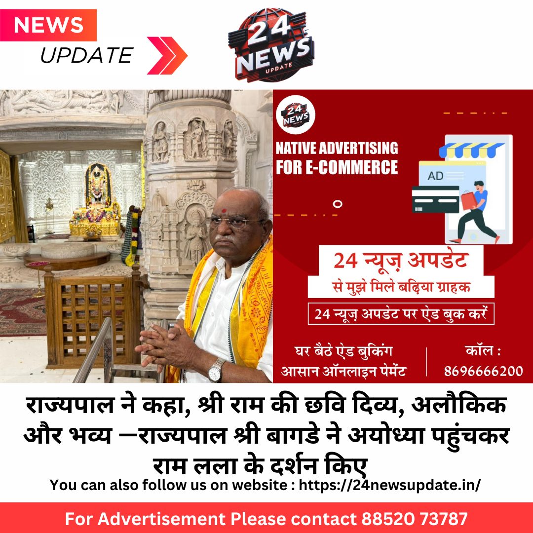 24 न्यूज़ अपडेट जयपुर। राज्यपाल हरिभाऊ बागडे ने बुधवार को अयोध्या पहुंचकर परिजनों सहित भगवान श्री राम लला के दर्शन किए। राज्यपाल श्री बागडे ने मर्यादा पुरूषोत्तम भगवान श्री राम की इस दौरान पूजा-अर्चना की। उन्होंने भगवान से राष्ट्र और राज्य की समृद्धि, सम्पन्नता और खुशहाली की कामना की। राज्यपाल ने श्री राम के अलौकिक स्वरूप को देख भाव विभोर होते हुए कहा कि श्री राम की छवि दिव्य, अलौकिक और भव्य है। Share this: Share on X (Opens in new window) X Share on Facebook (Opens in new window) Facebook More Email a link to a friend (Opens in new window) Email Share on WhatsApp (Opens in new window) WhatsApp Like this:Like Loading... Related Discover more from 24 News Update Subscribe to get the latest posts sent to your email. Type your email… Subscribe Post navigation ब्रेकिंग : राजस्थान सरकार इलेक्ट्रिक वाहनों के लिए देगी 200 करोड़ रू की सब्सिडी फोन टेपिंग पर आप-दा राहत मंत्री किरोड़ी का यू टर्न, गलती मानी, भाजपा को नोटिस का जवाब दिया