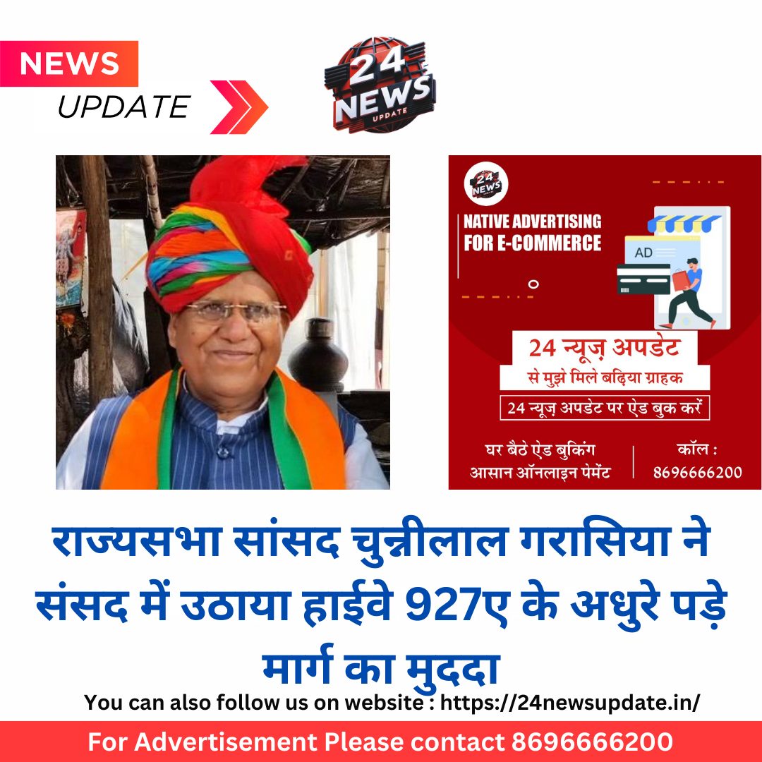 24 न्यूज अपडेट उदयपुर। राज्यसभा सांसद चुन्नीलाल गरासिया ने बुधवार को राज्यसभा में नेशनल हाईवे संख्या 927ए के अधूरे पड़े मार्ग का मुदा उठाया। सांसद ने राज्यसभा में राजस्थान के उदयपुर संभाग में स्थित बावलवाड़ा क्षेत्र की एक गंभीर समस्या की ओर ध्यान आकर्षित करते हुए बताया कि भारत सरकार के सड़क परिवहन और राजमार्ग मंत्री श्री नितिन गडकरी ने पूर्व में राष्ट्रीय राजमार्ग संख्या 927ए के निर्माण की घोषणा उदयपुर में की थी जो स्वरूपगंज, राजस्थान से रतलाम मध्यप्रदेश तक बनाना था। अच्छी मंशा से काम भी हुआ और बासवाड़ा से खेरवाड़ा तक मार्ग बन भी चुका परन्तु खेरवाड़ा से लेकर स्वरूपगंज के बीच बावलवाड़ा गरणवास तक लगभग 45 किलोमीटर लम्बा काम अभी पूरा नही होकर अधूरा पड़ा हैं, जिसकी वजह से प्रतिदिन इस राजमार्ग पर सड़क हादसे होते रहते हैं, अब तक दुर्घटनाओं में लगभग 7 अकाल मृत्यु इस मार्ग पर हो चुकी हैं। कई सरकारी कर्मचारी, विद्यार्थी, कामकाजी मजदूर, व्यापारी, पर्यटक प्रतिदिन इस मार्ग से गुजरते है जो हमेशा किसी अनहोनी की आंशका में गुजरते है। इस सबंध में गरासिया ने भारत सरकार और सड़क परिवहन और राजमार्ग मंत्री से राष्ट्रीय राजमार्ग संख्या 927ए पर खेरवाड़ा से लेकर स्वरूपगंज के बीच बावलवाड़ा क्षेत्र में गरणवास तक अधूरे पड़े लगभग 45 किमी मार्ग अतिशीघ्र बनवाने की मांग की है।