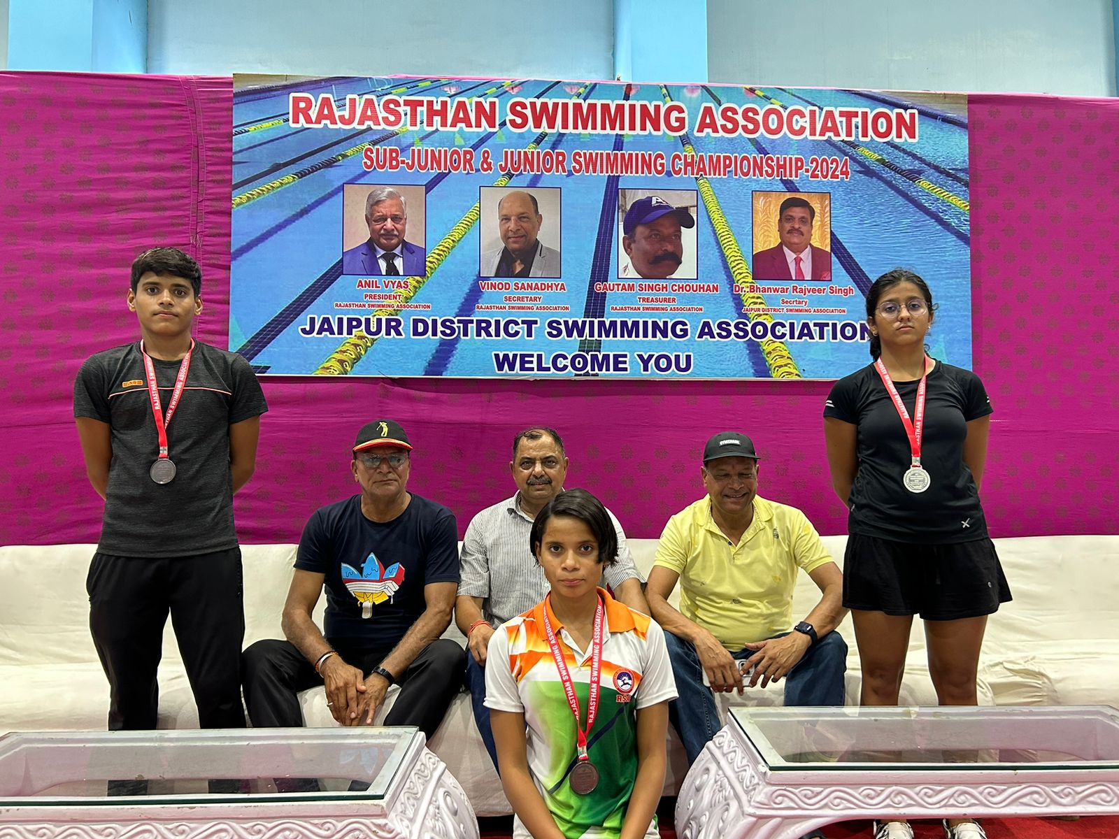 24 न्यूज अपडेट. उदयपुर। खेलगांव तैराकी कोच डॉ. महेश पालीवाल ने बताया कि हाल ही में राजस्थान तैराकी संघ के तत्वावधान में,जयपुर में चल रही राज्य स्तरीय जूनियर तैराकी प्रतियोगिता में महाराणा प्रताप खेलगांव उदयपुर के तैराकों का दबदबा क़ायम रहा। दो दिन से चल रही इस प्रतियागिता में विधि सनाढ़्य 100 & 200 मीटर ब्रेस्ट स्ट्रोक में दो स्वर्ण, 50 मीटर बटरफ्लाई में सिल्वर अवम् 200 मीटर आईएम में सिल्वर पदक जीता। उसी के जुड़वा भाई विधान सनाढ़्य ने 200 मीटर व 100 मीटर बटरफ्लाई में कांस्य पदक, उत्सवी दवे ने 1500 मीटर फ्री स्टाइल में कांस्य पदक 100 मीटर बैक में सिल्वर पदक हासिल किया। साथ ही 4 & 100 मीटर फ्री स्टाइल रिले में सिल्वर व 4 & 100 मीटर आईएम में सिल्वर मेडल प्राप्त किया। प्रतियोगिता के आखऱी दिन और भी अधिक पदक आने की पूर्ण संभावना है। खिलाडिय़ों की इस उपलब्धि पर राजस्थान तैराकी संघ के सचिव विनोद सनाढ़्य , ललित सिंह झाला, जिला खेल अधिकारी अजीत जैन एवं सभी उदयपुर खेल कोच ने बधाई दी एवं राष्ट्रीय प्रतियोगिता के लिए शुभकामनायें प्रेषित की।