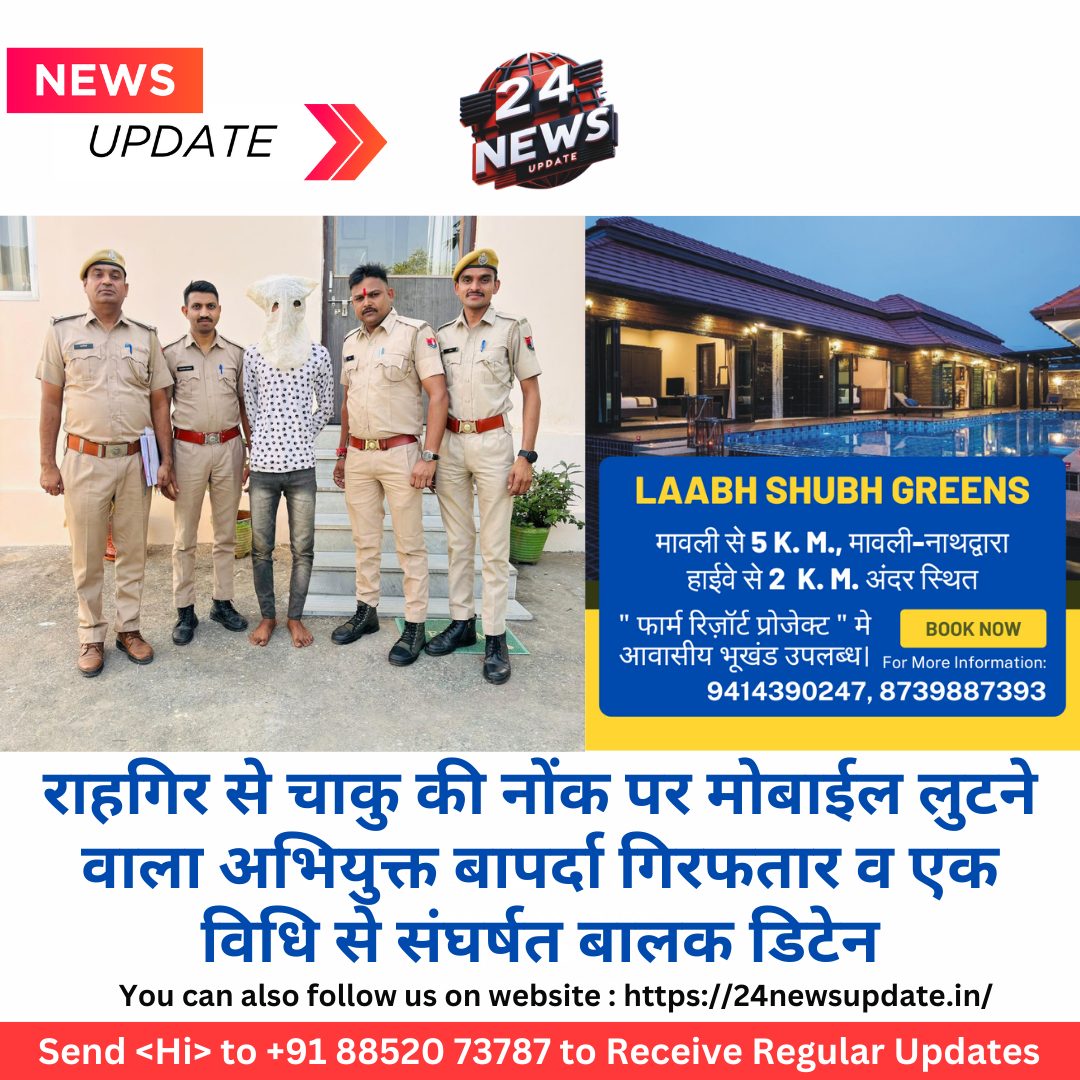 24 न्यूज़ अपडेट उदयपुर. दिनांक 11.11.2024 को परिवादी श्री राजू मेघवाल पिता तुलसीराम मेघवाल उम्र 17 वर्ष जाति मेघवाल निवासी मोरडी थाना घासा तहसील मावली जिला उदयपुर ने उपस्थित थाना हो एक लिखित रिपोर्ट इस आशयस की पेश कि कि दिनांक 9.11.2024 को समय करिब शाम 8.30 बजे के आस पास सब्जी मण्डी से सवीना की तरफ आ रहा था तब भीनिया बावजी मन्दिर के पास रेल्वे पटरी क्रॉस करने के बाद दो लड़को ने मुझे रोक दिया और चाकु दिखाकर डरा धमका कर मेरा वीवो व कम्पनी का मोबाईल लुट लिया और मुझे कहीं कि यहाँ से चला जा नही तो तुझे जान से मार दुगों जिसके डर के मारे मैं वहीं से थोड़ा आगे आकर मेरे भाई गोपाल को किसी राहगीर के मोबाईल से फोन कर बुलाया। जिसके बाद हम गाँव चले गये जो आज दिनांक 11.11.2024 को थाने पर आये है, रिपोर्ट करता हूँ कानुनी कार्यवाही करे। वगैरा रिपोर्ट पर थाना हाजा पर प्रकरण संख्या 540/2024 धारा 309 (4).3 (5) बी०एन०एस० 2023 के तहत