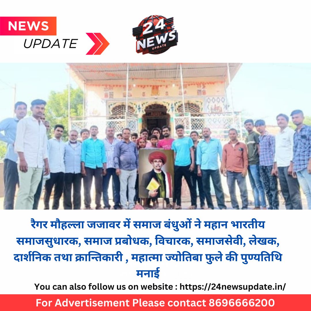 24 न्यूज अपडेट शाहपुरा. आज रैगर मौहल्ला जजावर में समाज बंधुओं ने महान भारतीय समाजसुधारक, समाज प्रबोधक, विचारक, समाजसेवी, लेखक, दार्शनिक तथा क्रान्तिकारी , महात्मा ज्योतिबा फुले की पुण्यतिथि मनाई गई इस अवसर पर डॉ अम्बेडकर मेमोरियल वेलफेयर बूंदी के उपाध्यक्ष कन्हैया लाल आलोरिया ने महात्मा ज्योतिबा फुले के जीवन पर विस्तार से प्रकाश डाला , महात्मा फुले ने महाराष्ट्र में सत्य शोधक समाज , नामक संस्था का गठन किया। ओर जीवनपर्यंत महिलाओं पिछडे और अछूतो के उत्थान के लिय इन्होंने अनेक कार्य किए। समाज के सभी वर्गो को शिक्षा प्रदान करने के ये प्रबल समथर्क थे। वे भारतीय समाज में प्रचलित जाति पर आधारित विभाजन और भेदभाव के विरुद्ध थे।इनका मूल उद्देश्य स्त्रियों को शिक्षा का अधिकार प्रदान करना, बाल विवाह का विरोध, विधवा विवाह का समर्थन करना रहा है। फुले समाज की कुप्रथा, अंधश्रद्धा की जाल से समाज को मुक्त करना चाहते थे। अपना सम्पूर्ण जीवन उन्होंने स्त्रियों को शिक्षा प्रदान कराने में, स्त्रियों को उनके अधिकारों के प्रति जागरूक करने में व्यतीत किया.१९ वी सदी में स्त्रियों को शिक्षा नहीं दी जाती थी। महात्मा फुले महिलाओं को स्त्री-पुरुष भेदभाव से बचाना चाहते थे। उन्होंने कन्याओं के लिए भारत देश की पहली पाठशाला पुणे में बनाई थीं। स्त्रियों की तत्कालीन दयनीय स्थिति से फुले बहुत व्याकुल और दुखी होते थे इसीलिए उन्होंने दृढ़ निश्चय किया कि वे समाज में क्रांतिकारी बदलाव लाकर ही रहेंगे। उन्होंने अपनी धर्मपत्नी सावित्रीबाई फुले को स्वयं शिक्षा प्रदान की। सावित्रीबाई फुले भारत की प्रथम महिला अध्यापिका थीं इस अवसर पर कन्हैया लाल रैगर , सोजी लाल रैगर , पुर्व सरपंच देवलाल रैगर,लालचंद वर्मा , मुकेश कुमार वर्मा , दुर्गा लाल रैगर , रणजीत , हेमराज रैगर , महावीर रैगर, लेखराज रैगर, मुकेश कुमार रैगर , देवलाल रैगर ,चोथमल वर्मा , राजेन्द्र कुमार वर्मा , लक्ष्मीनारायण रैगर , बबलु कुमार वर्मा , भंवरलाल रैगर , विनोद कुमार , सत्यनारायण रैगर, व अन्य समाज बंधु उपस्थित रहे