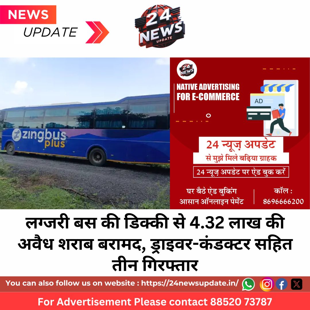 24 News Update भीलवाड़ा. जिले में अवैध मादक पदार्थों की तस्करी के खिलाफ पुलिस का सख्त अभियान जारी है। इसी कड़ी में कारोई थाना पुलिस ने बड़ी कार्रवाई करते हुए एक लग्जरी ट्रैवल्स बस से 4 लाख 32 हजार रुपये मूल्य की अवैध शराब बरामद की है। शराब को बस की डिक्की में अन्य सामानों के बीच छुपाकर ले जाया जा रहा था। पुलिस ने मौके से बस ड्राइवर, कंडक्टर और उनके एक साथी को गिरफ्तार कर लिया है।