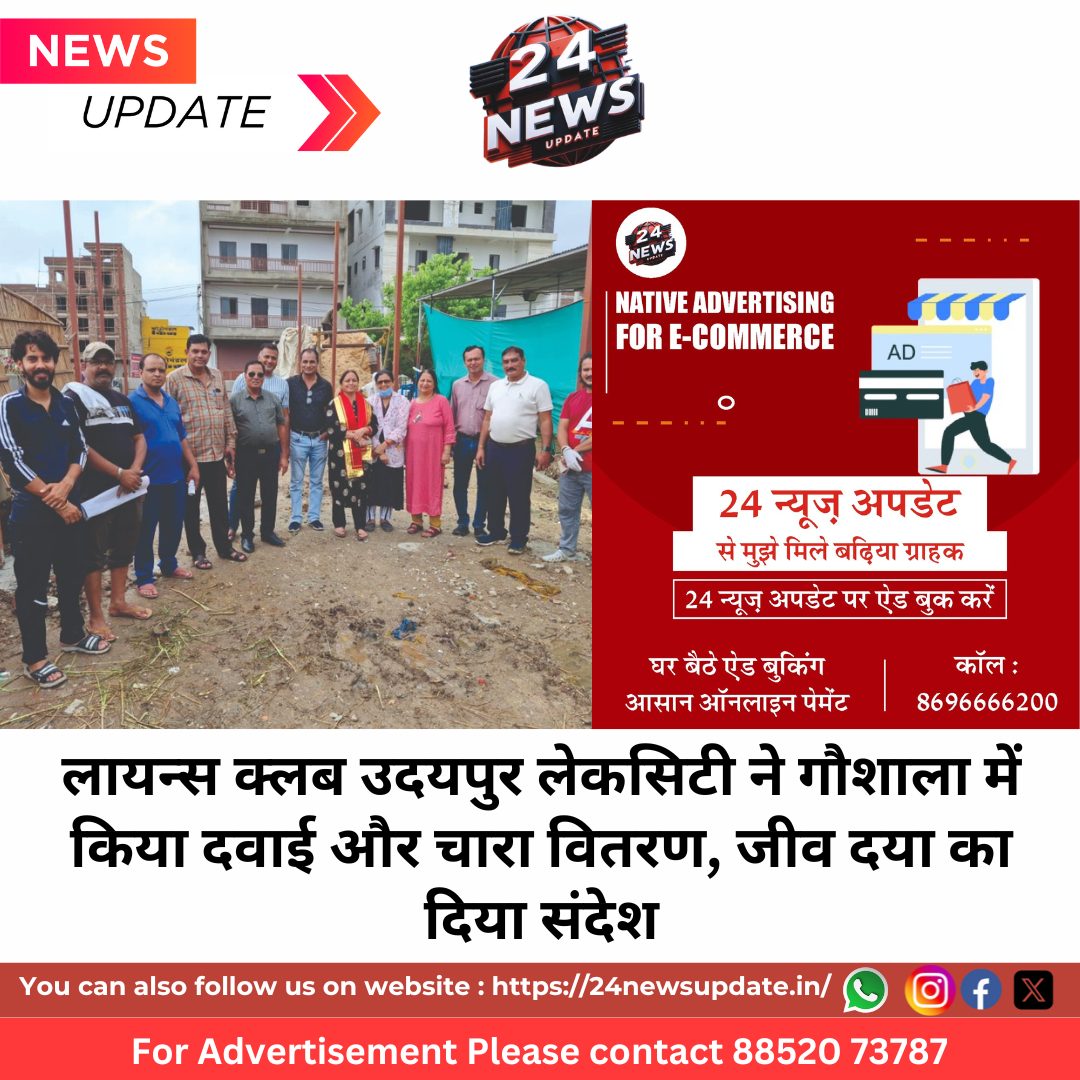 24 News Update उदयपुर, 3 जुलाई। लायन्स क्लब उदयपुर लेकसिटी ने गुरुवार को जीव दया की भावना के तहत ‘अपना घर गौशाला’, परशुराम चौराहा में बीमार व घायल गायों के लिए दवाइयों, चारे और पशु आहार का वितरण किया। इस सेवा कार्य में क्लब सदस्यों ने सक्रिय भागीदारी निभाई और गौसेवा के प्रति अपनी प्रतिबद्धता दोहराई।