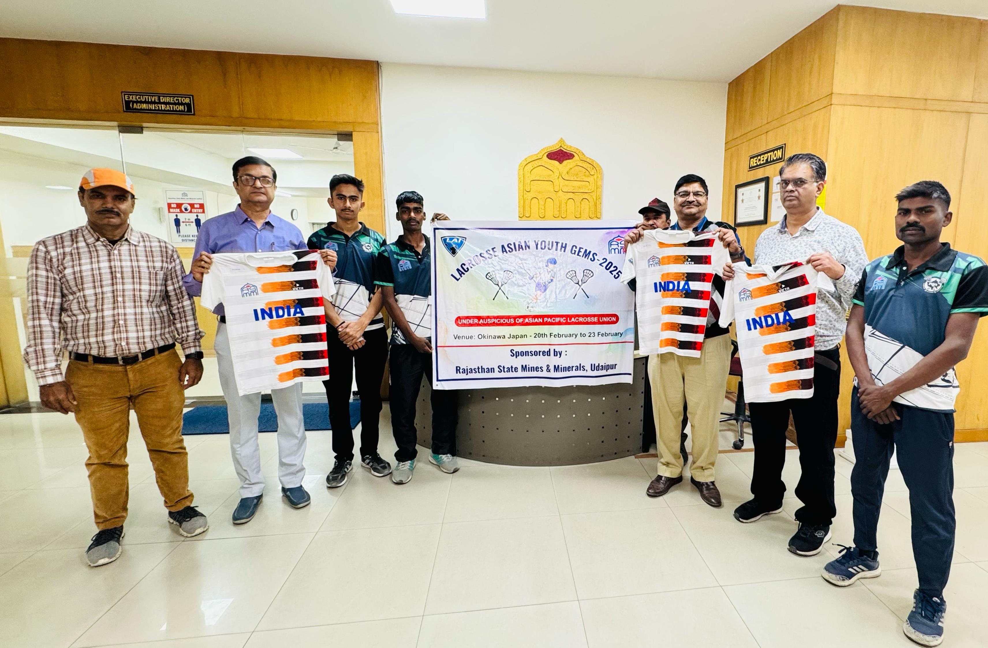24 न्यूज़ अपडेट उदयपुर । ओकीनावा जापान में 20 से 23 फरवरी तक आयोजित होने वाली लेक्रोज यूथ एशियन गेम्स के लिए भारतीय टीम मंगलवार को रवाना हुई। इस टीम में राजस्थान से चयनित तीनों खिलाडिय़ों के टीशर्ट का विमोचन टीम प्रमोटर राजस्थान स्टेट माइन्स एंड मिनिरल्स लिमिटेड के निदेशक भगवती प्रसाद कलाल ने किया। श्री कलाल ने भारतीय टीम में चयनित मोहनलाल गमेती, खुमाराम गमेती व प्रणय त्रिपाठी को टीशर्ट सौंपकर शुभकामनाएं दी। इस अवसर पर जनरल मैनेजर राजेंद्र राव, सेंट्रल मार्केटिंग हेड हनुमत सिंह, डिप्टी जनरल मैनेजर बी एस पत्राबत, अधिकारीगण प्रशिक्षक नीरज बत्रा आदि उपस्थित थे।