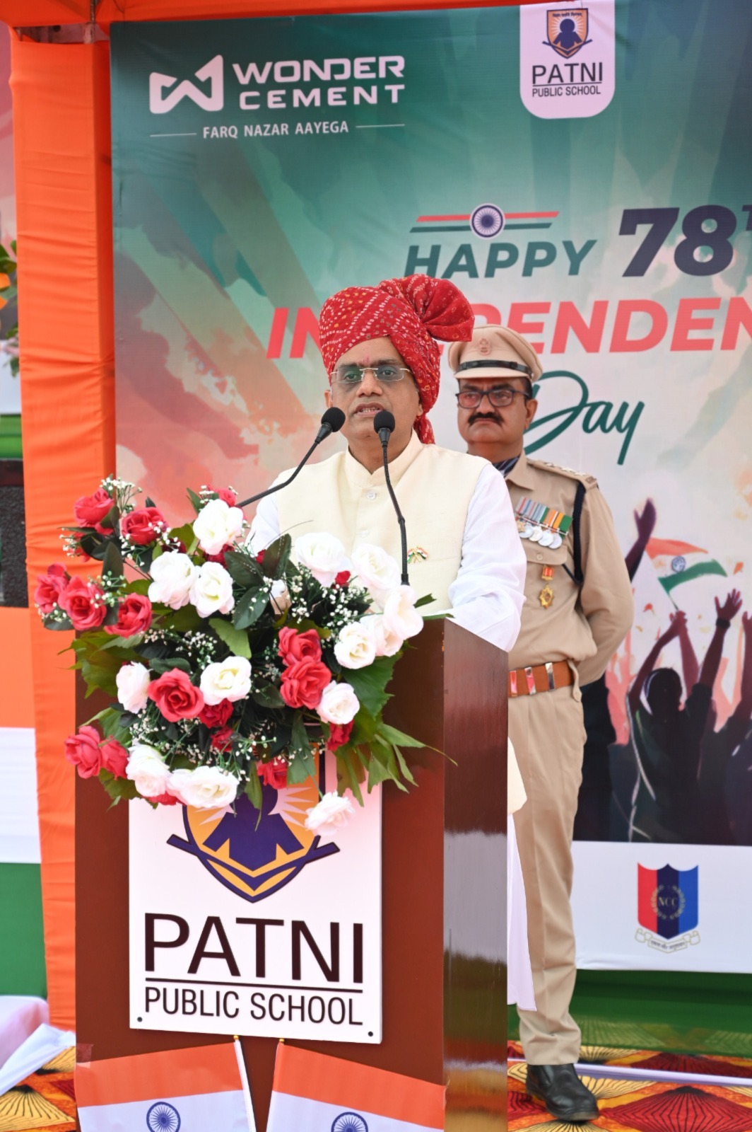 कविता पारख 24 न्यूज़ अपडेट निम्बाहेड़ा. वंडर सीमेंट लिमिटेड, आर. के. नगर, निम्बाहेड़ा के पाटनी पब्लिक स्कूल में 78 वाँ स्वतंत्रता दिवस समारोह कम्पनी के यूनिट हेड एवं विद्यालय प्रबंधक श्री नितिन जैन के मुख्य आतिथ्य तथा श्रीमती अरुणा जैन के विशिष्ठ आतिथ्य में आयोजित किया गया। इस शुभअवसर पर कम्पनी के यूनिट हेड एवं विद्यालय प्रबंधक श्रीमान नितिन जैन ने देश की स्वतन्त्रता के लिए अपना जीवन न्योछावर करने वाले शहीदों को पुष्पांजलि अर्पित कर ध्वजारोहण किया एवं राष्ट्रीय ध्वज को सलामी दी गई। ध्वजारोहण के साथ ही बच्चों ने स्कूल बेण्ड के साथ राष्ट्रगान प्रस्तुत किया। इसके पश्चात् मुख्य अतिथि महोदय को वंडर सीमेंट लि. के मुख्य सुरक्षा अधिकारी श्री नागेन्द्र सिंह चुण्डावत ने विद्यालय के एन.सी.सी. कैडेट्स तथा वंडर सीमेंट के सुरक्षा कर्मियों की सूसज्जित परेड का निरीक्षण कराया, निरीक्षण के उपरान्त श्री जैन ने मार्चपास्ट को सलामी दी तथा अपने उद्बोधन में सभी को स्वतन्त्रता दिवस की शुभकामनाएं देते हुए अपने संबोधन में कहा कि देश भक्तों के 91 वर्षों के कडे संघर्ष की बदोलत आज हम स्वतन्त्र भारत में पूरी आजादी के साथ गर्व से जी रहे है। श्री जैन ने देश की प्रगति के बारे बताते हुए कहा की भारत आज विश्व की तीसरी इकोनोमी के रुप में उभरा है। श्री जैन ने युवाओं को प्रेरित करते हुए कहा की स्वयं एवं अपने परिवार को हमेशा खुश रखे और विकसित राष्ट्र में स्वाभीमान के साथ सहयोगि बने। इस दौरान सीबीएसई बोर्ड परीक्षा 2024 में 90 प्रतिशत् और उससे अधिक अंक प्राप्त करने वाले पीपीएस के मेधावी विद्यार्थियों तथा खेल, वाद-विवाद सहित विभिन्न राष्ट्रीय स्तर की प्रतियोगिताओं में विषेश उपलब्धि प्राप्त करने वाले छात्रों को मुख्य आतिथी महोदय ने सम्मानित किया। स्वाधीनता दिवस के अवसर पर जिला स्तर पर आयोजित मुख्य समारोह में पीपीएस की होनहार छात्रा सुश्री चहक संचेती को सीबीएसई 12वीं बोर्ड परीक्षा 2024 में जिला स्तर पर सर्वाधिक 98 प्रतिशत् अंक प्राप्त करने पर मुख्य अतिथि माननीय नागरिक उड्डयन एवं सहकारिता मंत्री, राजस्थान सरकार श्रीमान गोतम दक द्वारा सम्मानित किया गया। साथ ही वंडर सीमेंट में आयोजित कार्यक्रम में पीपीएस के छात्रों ने देश की स्वतंत्रता की महिमा के गुणगाण करते हुए विभिन्न सांस्कृतिक कार्यक्रम प्रस्तुत किए जिसमें देश भक्ति गीत, ग्रूप डांस, लघु नाटीका का मंचन, हिन्दी-अंग्रेजी में भाषण एवं कवितापाठ, डम्बल पी.टी. इत्यादी रोचक प्रस्तुतियां दी, इसके पश्चात् कार्यक्रम के मुख्य अतिथि श्री जैन ने वंडर सीमेंट लि. में कार्य के दौरान अपनी उत्कृष्ट सेवाएं प्रदान करने वाले कर्मचारियों एवं सुरक्षा कर्मियों को महा प्रबंध