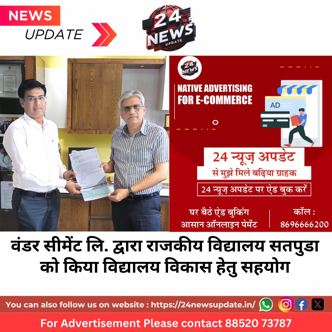 24 न्यूज़ अपडेट निम्बाहेड़ा. वंडर सीमेंट लि. निम्बाहेड़ा के CSR नीव इनिशिएटिव के तहत आज दिनांक 20.03.2025 को कम्पनी के *यूनिट हेड श्रीमान नितिन जैन द्वारा चित्तौड़गढ़ जिले के राजकीय उच्च माद्यमिक विद्यालय सतपुडा के प्रधानाचार्य एवं पीईईओ श्री विकास अग्रवाल को विद्यालयों मे निर्माण कार्य संपादित करवाने हेतु सहयोग राशि 15 लाख रुपये* का डी.डी. हस्तांतरित किया गया।
