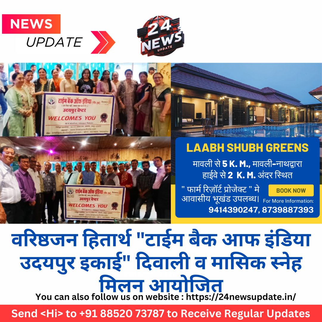 24 न्यूज़ अपडेट उदयपुर. वरिष्ठजन की सेवार्थ समर्थित टाईम बैक आफ इंडिया – उदयपुर इकाई का दिवाली व मासिक स्नेह मिलन एक निजी प्रतिष्ठान मे आयोजित हुआ।