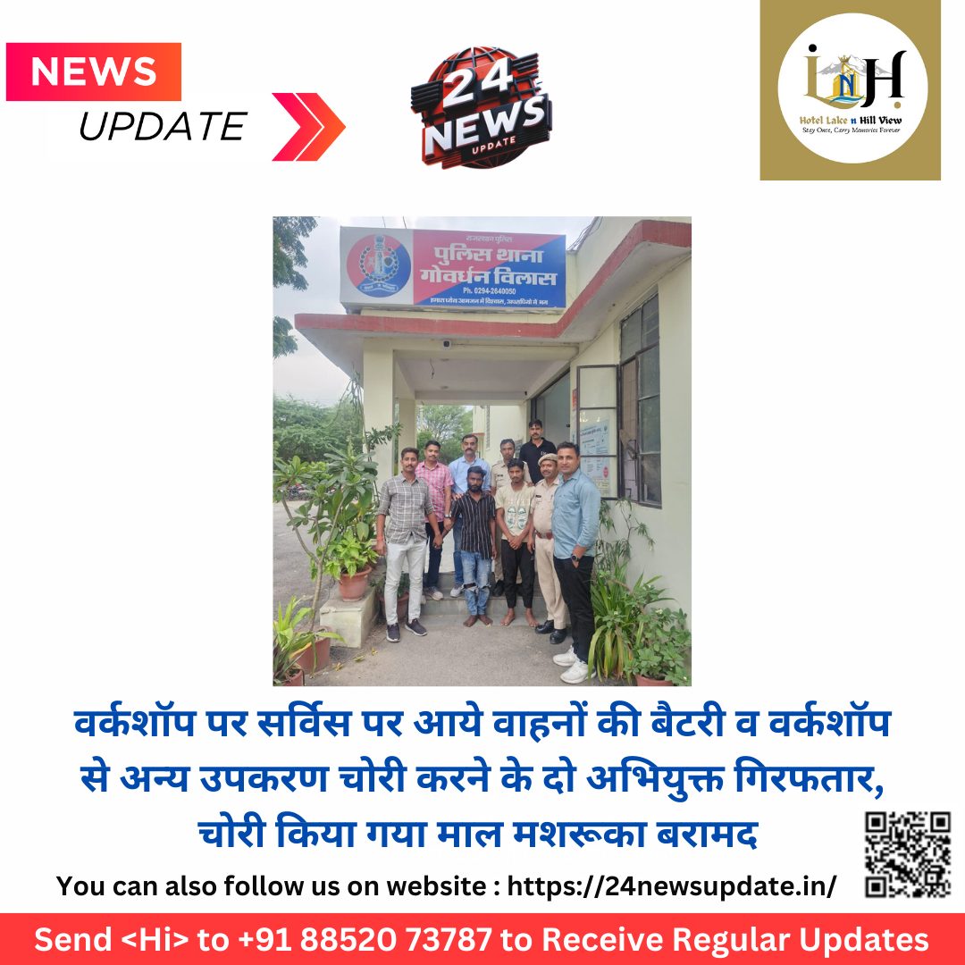 24 न्यूज़ अपडेट उदयपुर। जिला पुलिस अधीक्षक उदयपुर श्री योगेश गोयल भा०पु० से० के निर्देशानुसार, श्री गोपाल स्वरूप मेवाडा आरपीएस, अतिरिक्त पुलिस अधीक्षक (मुख्यालय) उदयपुर के सुपरविजन में श्री गजेन्द्र सिंह राव वृताधिकारी वृत गिर्वा के निर्देशन में श्री भवानी सिंह राजावत पु.नि. थानाधिकारी पुलिस थाना गोवर्धनविलास के नेतृत्व में गोवर्धनविलास पुलिस टीम ने कार्यवाही करते हुए थाना हाजा के प्रकरण संख्या 362/2024 धारा 331(4), 305 (ए) भारतीय न्याय संहिता में कार्यवाही करते हुए वर्कशॉप से चोरी करने के आरोपीगण भंवर उर्फ भोमिया उर्फ ओमिया कालबेलिया पिता रमेश कालबेलिया उम्र 25 साल निवासी इन्द्रा कॉलोनी थाना गोवर्धनविलास जिला उदयपुर व अंकित उर्फ कालु उर्फ दिता कालबेलिया पिता नारायण कालबेलिया उम्र 20 साल निवासी पूर्बिया कॉलोनी, मल्लातलाई थाना अम्बामाता जिला उदयपुर को गिरफतार किया गया है व उनके कब्जे से चोरी किया गया माल मशरूका बरामद किया गया है। घटना का विवरण:- दिनांक 11.09.2024 को प्रार्थी श्री मोहन लाल लौहार पिता परस राम लौहार निवासी लव-कुश मोटर गैराज गमेरबाग के सामने देवाली थाना गोवर्धनविलास जिला उदयपुर ने एक प्रकरण दर्ज करवाया कि प्रार्थी का सरस डेयरी से आगे मुख्य मार्ग पर गमेर बाग के सामने लव-कुश मोटर गेराज है। इस गेराज के पिछे ही प्रार्थी का मकान है। दिनांक 11.09.24 को प्रार्थी ने सुबह गैराज खोला तो सामान बिखरा पड़ा था। कोई अज्ञात बदमाश रात्रि के समय में गैराज में प्रवेश कर प्रार्थी के गैराज में रखे सामान 12 गाडीयों की बैटरी, 15 गाडीयों के एलोव्हिल, डेंटिंग के टुल्स, और पुराने पार्टस व कमरे का ताला तोडकर केमरे के डीवीआर राउटर तथा अलमारी में पडे म्युजिक सिस्टम व अन्य सामान चोरी कर ले गये है। जिनकी अनुमानीत लागत 3,00,000/- रू तक है उक्त घटना पर प्रकरण संख्या 362/2024 धारा 331 (4), 305 (ए) भारतीय न्याय संहिता में दर्ज किया गया। पुलिस द्वारा किये गये प्रयासः उक्त घटना के पश्चात प्रकरण दर्ज कर थानाधिकारी द्वारा घटनास्थल का निरीक्षण कर थाना स्तर पर एक पुलिस टीम का गठन कर उक्त घटना के खुलासे व अज्ञात मुल्जिमानों को ट्रेस ऑउट करने के निर्देश प्रदान किये गये। निर्देशानुसार पुलिस टीम ने घटनास्थल के आस पास के क्षेत्र में करीब 25 सीसीटीवी कैमरे को चैक किया गया। उक्त सीसीटीवी से प्राप्त फुटेज व प्राप्त आसूचना के आधार पर थाना हाजा का हिस्ट्रीशीटर भवरू उर्फ भोमिया की गतिविधियों संदिग्ध पाई गई। जिसके आधार पर पुलिस टीम ने भरकश प्रयास की हिस्ट्रीशीटर नंवर उर्फ भोमिया उर्फ ओमिया को डिटेन कर पूछताछ की तो उसने अपने साथी अंकित उर्फ कालू उर्फ दिता व अन्य साथीयों के साथ मिलकर उक्तटना को अंजाम देना स्वीकार किया। पुलिस टीम द्वारा उनके कब