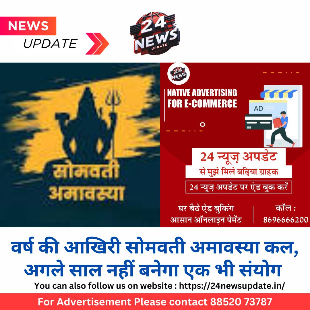 24 न्यूज अपडेट स्टेट डेसक। वर्ष 2024 की आखिरी सोमवती अमावस्या सोमवार को हैं। अगले वर्ष यह संयोग एक बार भी अमावस का यह संयोग नहीं बन रहा है। 2026 में 19 मार्च तक सोमवती अमावस्या का योग घटित नहीं होगा। धार्मिक मान्यता के अनुसार देव पितृकार्य सोमवती अमावस्या को विशेष फलकारी माना गया है। जिन जातकों की कुंडली में अमावस्या दोष होता है, उन्हें इस दिन दर्श शांति वैदिक विधि-विधान से कराना चाहिए। इस दिन पवित्र नदियों में स्नान करने का भी महत्व है। पितरों के तर्पण, श्राद्ध के लिए जरूरतमंदों को वस्त्र दान, अन्न दान आदि को भी शुभ माना जाता है। मान्यता है कि इस दिन किए गए दान-पुण्य का अनंत गुना फल मिलता है। द्वापर युग में पांडवों ने अपने पूर्वजों के पिंडदान के लिए पुष्कर में कई वर्षों तक रहकर सोमवती अमावस्या का इंतजार किया था, लेकिन उन्हें भी सोमवार को पढ़ने वाली अमावस्या का यह दुर्लभ संयोग प्राप्त नहीं हुआ था. उन्हें पुष्कर छोड़कर हिमालय जाना पड़ा, लेकिन वहां भी सोमवती अमावस्या का संयोग नहीं मिला था.