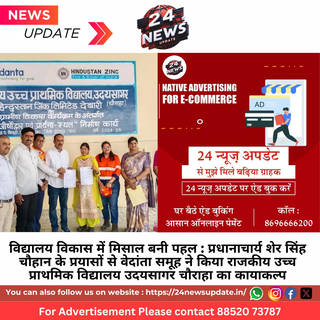 24 News Update उदयपुर। पंचायत समिति कुराबड़ क्षेत्र के अंतर्गत बिछड़ी ग्राम पंचायत में स्थित राजकीय उच्च प्राथमिक विद्यालय, उदयसागर चौराहा में नवीनीकरण कार्य पूर्ण होने पर भामाशाह समारोह का आयोजन किया गया। वर्षों से विद्यालय भवन की दीवारों के क्षतिग्रस्त होने, छतों से पानी रिसने तथा प्लास्टर गिरने जैसी गंभीर समस्याओं से जूझ रहे इस विद्यालय में किसी भी अनहोनी की संभावना बनी हुई थी। विद्यालय की जर्जर स्थिति को दृष्टिगत रखते हुए प्रधानाध्यापक शेर सिंह चौहान ने सजग पहल करते हुए विद्यालय विकास हेतु अभियान प्रारंभ किया। चौहान के दूरदर्शी प्रयासों एवं नेतृत्व में हिंदुस्तान जिंक लिमिटेड, देबारी के सहयोग से विद्यालय परिसर का व्यापक कायाकल्प कराया गया। इस पहल के अंतर्गत सम्पूर्ण भवन की मरम्मत, रंग-रोगन, विद्युत फिटिंग, चित्रकारी, प्रार्थना स्थल (डोम) सभागार निर्माण, बालक बालिकाओं के लिए पृथक शौचालय, सभी कक्षों में पंखों, लाइटों की सुविधा सहित लगभग 50 लाख रुपए के विभिन्न विकास कार्य सफलतापूर्वक संपन्न किए गए। इन प्रयासों से विद्यालय में एक प्रेरक, सुरक्षित एवं आधुनिक शिक्षण वातावरण का सृजन हुआ, जिसने न केवल विद्यार्थियों में नया उत्साह भरा, बल्कि सम्पूर्ण क्षेत्र में सकारात्मक संदेश भी दिया।