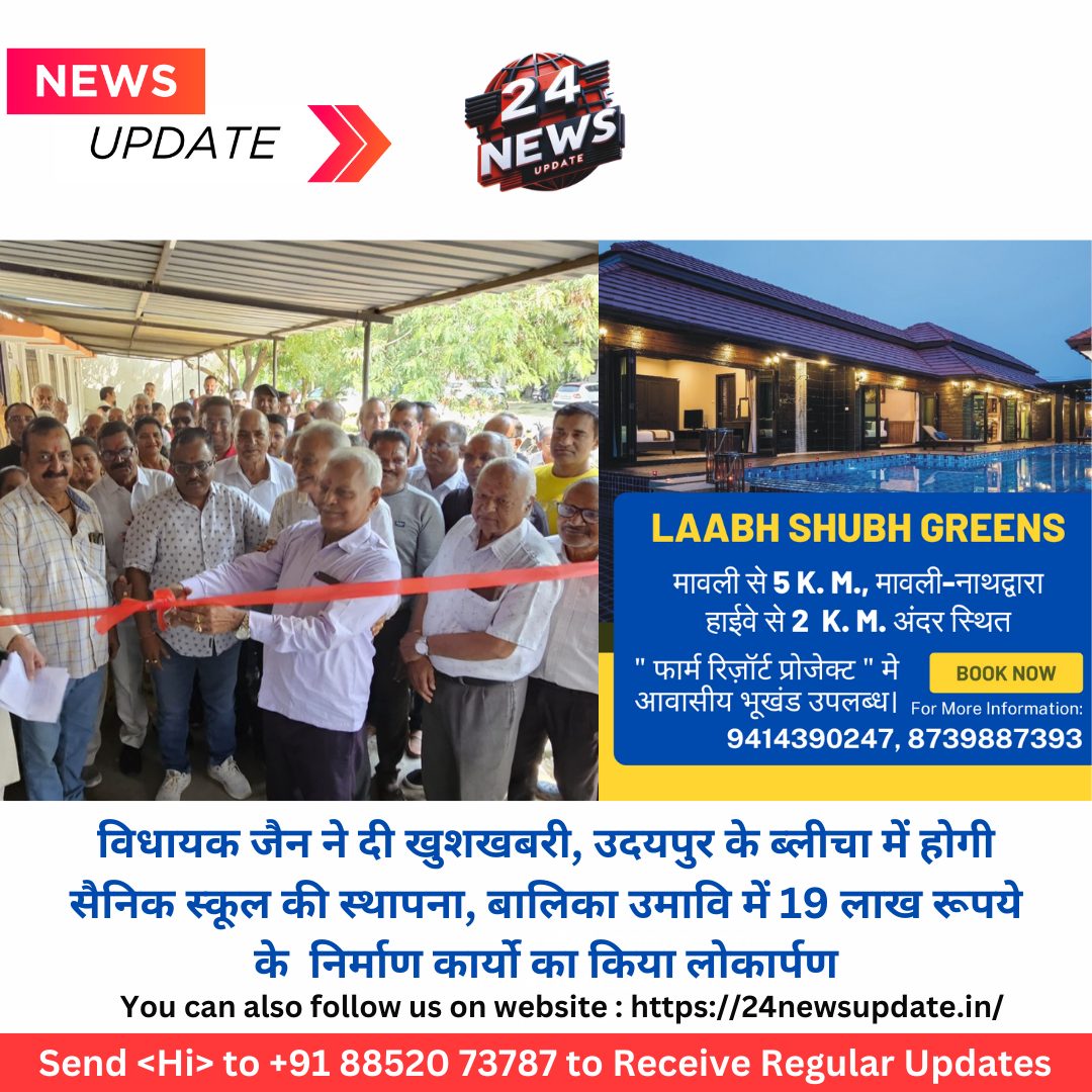 24 न्यूज अपडेट. उदयपुर। राजकीय बालिका उच्च माध्यमिक विद्यालालय आयड़ में 19 लाख रूपये से निर्मित कक्षा कक्ष, कार्यालय, रोड़ टाईल्स एवं गंगु कुंड सामुदायिक भवन के जिर्णोद्वार के निर्माण कार्यो का शिलान्यास गुरूवार को शहर विधायक ताराचंद जैन, जिलाध्यक्ष रविन्द्र श्रीमाली, उपमहापौर पारस सिंघवी, वार्ड पार्षद एवं गैराज समिति के अध्यक्ष मनोहर चौधरी, उपाध्यक्ष प्रेम सिंह शक्तावत, जगत नागदा, सत्यनारायण चौधरी, ने फीता काट कर किया। इस अवसर पर आयोजित सभा में सम्बोधित करते हुए ताराचंद जैन ने शहर को एक नई सौगात देते हुए कहा कि अतिशीघ्र आगामी दिनों में बलीचा में सैनिक स्कुल की स्थापना की जायेगी जिसकी कार्य योजना तैयार की जा चुकी है, जिससे शहर के युवाओं को इसका लाभ मिलेगा। जैन ने कहा कि शहर के प्रत्येक विद्यालय में नगर निगम, नगर विकास प्रन्यास, विधायक कोटे से करोड़ों रूपयों के निर्माण के कार्य कराये गये है। प्रत्येक विद्यालय में विधायक प्रतिनिधि की नियुक्ति की गई है उनकी जिम्मेदारी है कि वे विद्यालय की कमियों एवं आवश्यक कार्यो की कार्य योजना बना कर मुझ तक पहुंचाये। मनोहर चौधरी ने बताया कि इस अवसर पर मंडल अध्यक्ष जितेन्द्र मारू, महेश भावसार, डॉ. जिनेन्द्र शास्त्री, खेमराज जोशी, वेणी राम सालवी, पार्षद करणमल जारौली, राकेश् जैन, ज्योति लौहार, कुसुम पंवार, राजकुमार परमार, प्रेमशंकर सुथार, आनंदी लाल चितौड़ा, शिवशंकर नागदा, सुरेश सालवी, नवीन पालीवाल, चिराग वसीटा, सुनील चितौड़ा, राजेश चितौड़ा, गोपाल सालवी, भेरूलाल पहाड़िया, धजराज मेवाडा, भावना माली सहित वार्ड के कार्यकर्ता एवं आमजन उपस्थित थे। संचालन मनोहर चौधरी ने किया जबकि आभार महेश भावसार ने जताया।
