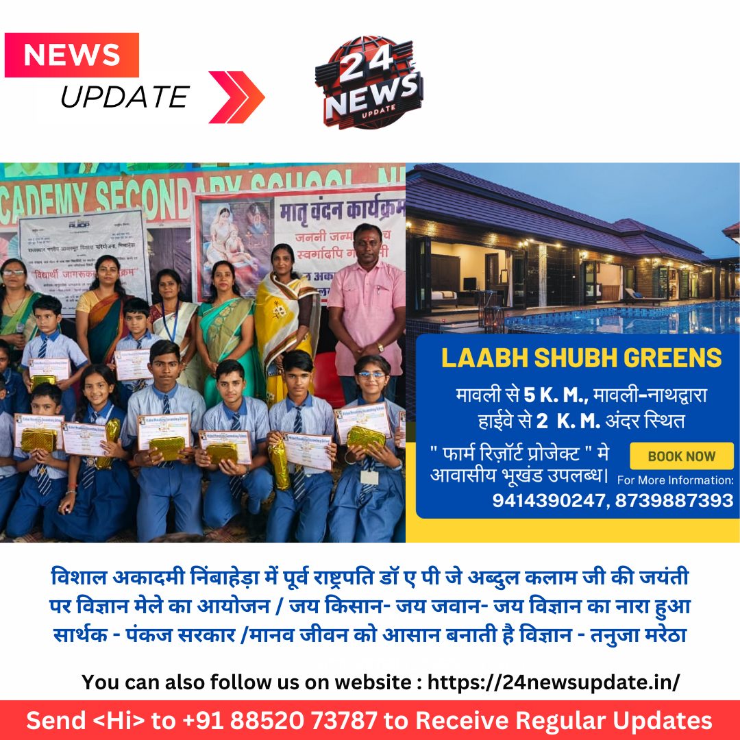 24 न्यूज़ अपडेट निम्बाहेडा। विशाल अकादमी माध्यमिक विद्यालय में पूर्व राष्ट्रपति डॉक्टर ए.पी.जे. अब्दुल कलाम की जयंती पर विज्ञान मेला का आयोजन किया गया जिसमें 50 से अधिक प्रतिभागियों ने बढ़ चढ़कर हिस्सा लिया ।
