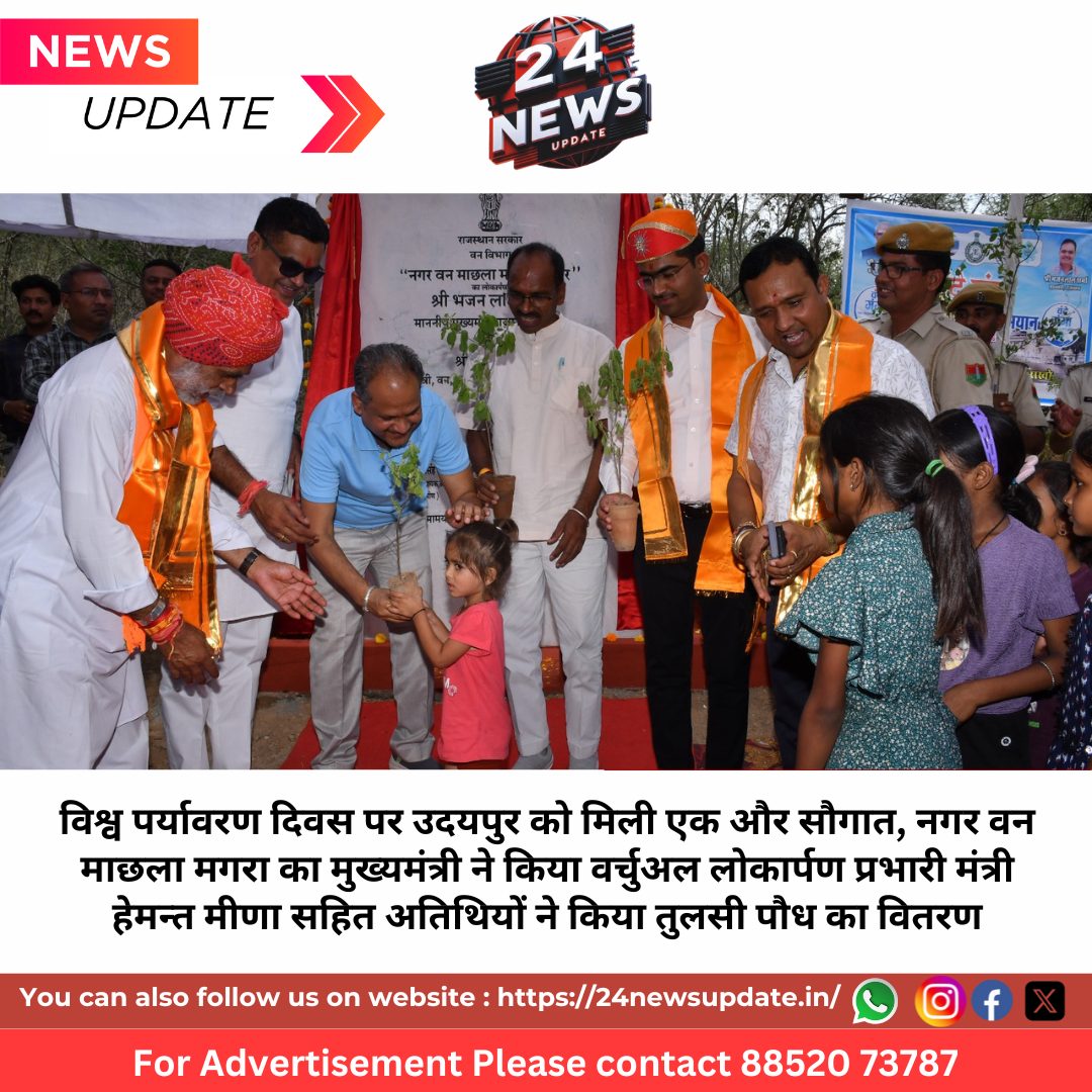24 News Update उदयपुर, 5 जून। विश्व पर्यावरण दिवस के उपलक्ष्य में गुरूवार को जिला स्तरीय कार्यक्रम सीसारमा मार्ग पर स्थित नगर वन माछला मगरा परिसर में हुआ। कार्यक्रम के मुख्य अतिथि राजस्व एवं उपनिवेशन मंत्री तथा जिले के प्रभारी मंत्री श्री हेमन्त मीणा रहे। खान एवं पेट्रोलियम विभाग के प्रमुख शासन सचिव तथा जिले के प्रभारी सचिव टी रविकान्त, सांसद डॉ मन्नालाल रावत, उदयपुर विधायक ताराचंद जैन, उदयपुर ग्रामीण विधायक फूलसिंह मीणा, उप जिला प्रमुख पुष्कर तेली, संभागीय आयुक्त सुश्री प्रज्ञा केवलरमानी, जिला कलक्टर नमित मेहता, समाजसेवी रविन्द्र श्रीमाली, गजपालसिंह भी बतौर आतिथ्य उपस्थित रहे। प्रारंभ में मुख्य वन संरक्षक वन्यजीव शैरू राम यादव, उप वन संरक्षक मुकेश सैनी, अजय चित्तौड़ा आदि ने अतिथियों का स्वागत किया।