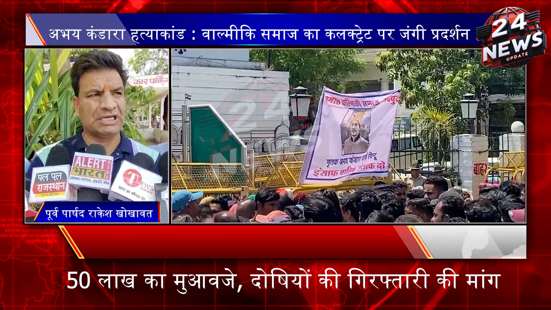 24 न्यूज अपडेट. चित्तौड़गढ़। वाल्मीकि समाज के युवक अभय कण्डारा के साथ चितौडगढ़ की होटल आराधना में हुई मारपीट और उसे छत से तीन मंजिल से नीचे फेंक देने के मामले में समाज में गहरा आक्रोष हैं। आज वाल्मीकि समाज की ओर से जिला कलक्ट्रेट पर जंगी प्रदर्शन किया गया व दोषियों के खिलाफ सख्त कार्रवाई करने, 50 लाख का मुआवजा देने, हत्याकांड में शामिल 7 अन्य लोगों को गिरफ्तार करने, होटल संचालकों को भी सलाखों के पीछे भेजने तथा इस मामले में धीमी गति से व एकतरफा रूप से जांच कर रहे जांच अधिकारी को बदलने की मांग की गई। प्रदर्शन के बाद समाजजनों ने आईजी और कलेक्टर को ज्ञापन दिया जहां से यह आश्वासन मिला कि हर संभव मदद कर सख्त कार्रवाई की जाएगी। आपको बता दें कि चित्तौड़गड़ में घटना के बाद अभय कंडारा की उदयपुर में उपचार के दौरान मौत हो गई थी। इसके बाद परिजनों ने होटल पर भी प्रदर्शन किया था। आज प्रदर्शन करने वाले समाजजनों ने कहा कि उन्हें होटल मैनेजमेन्ट की मिलीभगत का शक है। पुलिस प्रशासन द्वारा उक्त प्रकरण में ढुलमुल रवैया अपनाया जा रहा है जिससे समाज में भारी आक्रोष है। पुलिस प्रशासन व राज्य सरकार द्वारा उक्त प्रकरण की निष्पक्ष जांच नहीं हो रही है। जाँच अधिकारी (एइओ) को हटाकर किसी दूसरे जाँच अधिकारी से जाँच करवाई जाए।