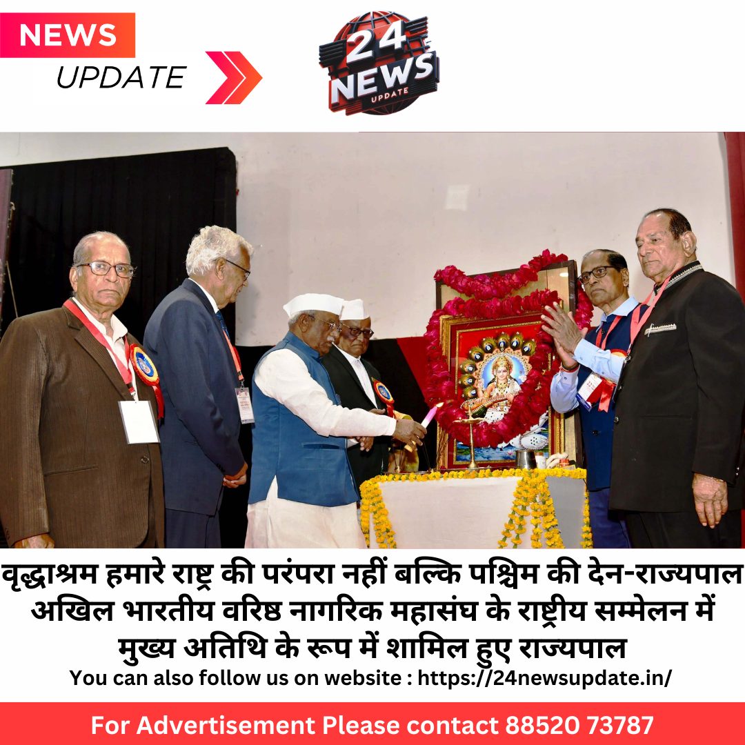 24 न्यूज़ अपडेट उदयपुर। राज्यपाल श्री हरिभाऊ बागड़े ने कहा कि हमारे देश में ब्रह्मचर्य, गृहस्थ, वानप्रस्थ एवं सन्यास आश्रम की परंपरा है वृद्ध आश्रम की नहीं। वृद्धाश्रम पश्चिम की देन है जहां पर वरिष्ठ नागरिकों को बोझ समझा जाता है। शनिवार को उदयपुर के मोहनलाल सुखाड़िया विश्वविद्यालय के स्वामी विवेकानंद सभागार में अखिल भारतीय वरिष्ठ नागरिक महासंघ के 22 वें राष्ट्रीय सम्मेलन में बतौर मुख्य अतिथि अपने संबोधन में उन्होंने यह बात कही। राज्यपाल बागड़े ने वरिष्ठ नागरिकों का आह्वान किया कि वे अपने शरीर एवं स्वास्थ्य का विशेष ख्याल रखें क्योंकि स्वस्थ शरीर ही सबसे बड़ा धन है। राष्ट्र की प्रगति में वरिष्ठ नागरिकों के अनुभव की महत्वपूर्ण भूमिका है। वरिष्ठ नागरिकों को अपनी शेष आयु देश,धर्म के उपयोग में लगानी चाहिए।