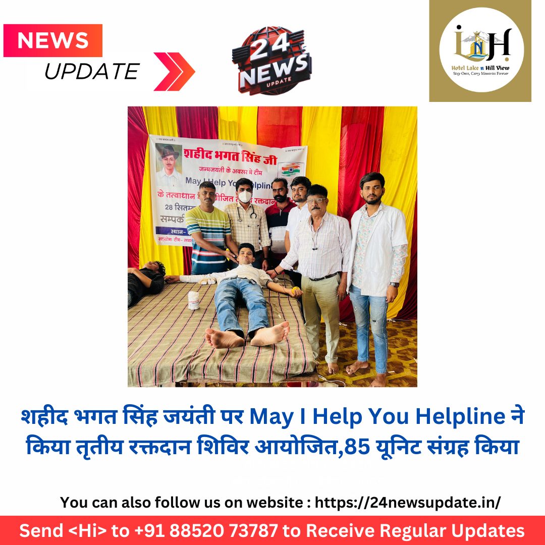 24 न्यूज़ अपडेट शाहपुरा. काछोला May I Help You Helpline काछोला के तत्वावधान में काछोला मे बगीची के बाला जी मंदिर प्रांगण में माँ भारती के वीर सपूत शहीदे आजम शहीद भगत सिंह की जन्म जयंती के अवसर पर रक्तदान शिविर आयोजित किया गया !