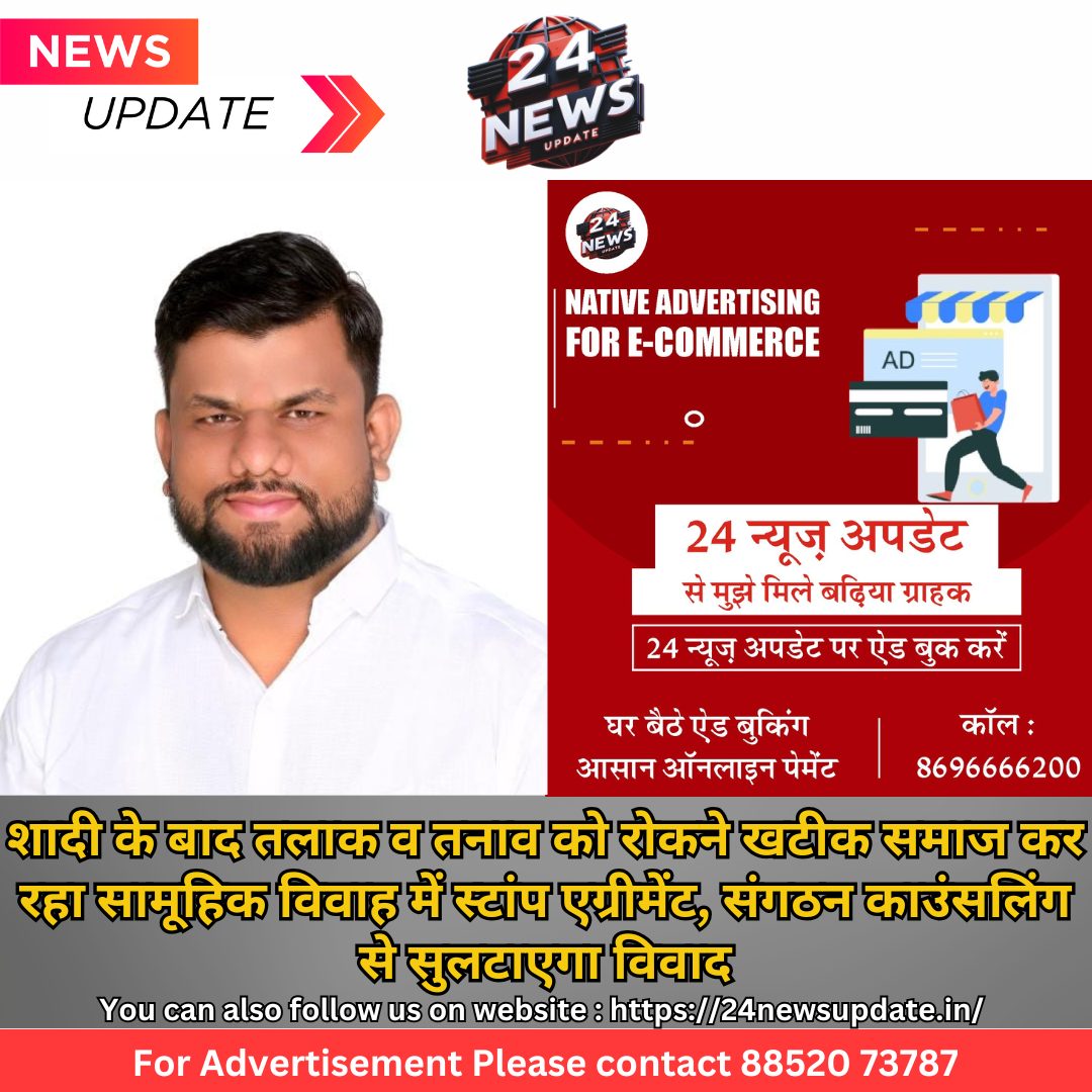 24 न्यूज़ अपडेट उदयपुर। विवाह के बाद बढते तलाक और तनाव के मामलों को देखते हुए पहली बार कोई समाज सामूहिक विवाह में क्रांतिकारी कदम उठा रहा है। यह पहल कर रहा है उदयपुर का खटीक समाज राष्ट्रीय संगठन। संगठन के बैनर तले 2 फरवरी बसंत पंचमी को सामूहिक विवाह का आयोजन है और इससे पहले संगठन ने सभी जोडो से 500 रुपए के स्टांप पर यह लिखवा कर लिया है कि 30 साल से पहले पति-पत्नी में किसी भी प्रकार का विवाद होने पर थाना या कोर्ट जाने की बजाए पहले वे संगठन के पास आएंगे, जहां काउंसलिंग से समाधान किया जाएगा।