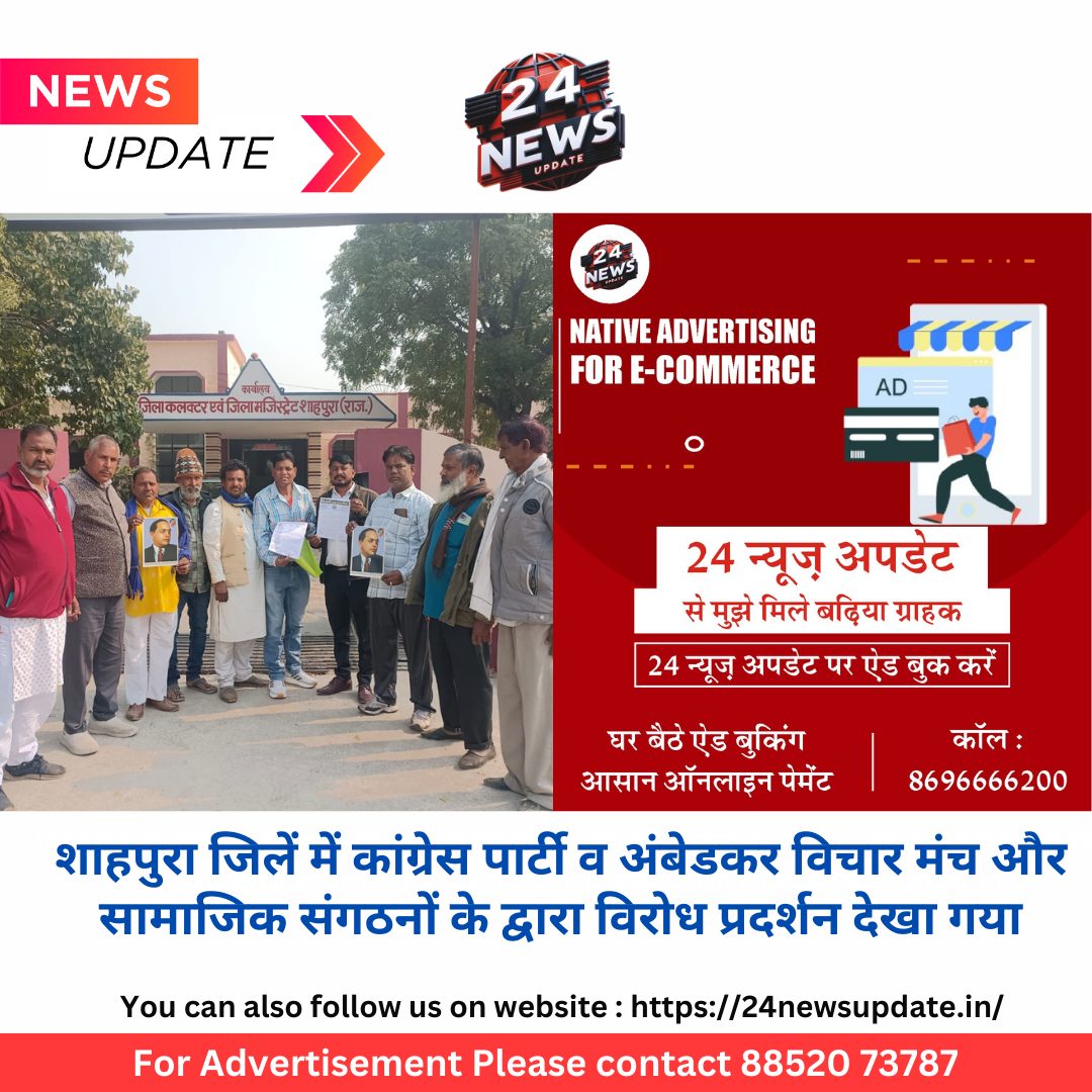 24 न्यूज़ अपडेट शाहपुरा .शाहपुरा ज़िला मुख्यालय में आज बाबा साहब भीमराव अंबेडकर के लिए आपत्जनिक टिप्पणी करने व राहुल गांधी के खिलाफ झूठा मुकदमा दर्ज करने पर कांग्रेस कार्यकर्ताओं ने गृहमंत्री अमित शाह का पुतला फूंका। पूर्व ब्लॉक कांग्रेस सेवादल अध्यक्ष जयंत जीनगर ने बताया कि कांग्रेस के राष्ट्रीय सचिव धीरज गुर्जर के निर्देश पर ब्लॉक व नगर कांग्रेस ने गृहमंत्री शाह के खिलाफ प्रदर्शन किया। पूर्व पार्षद रमेश सेन व सेवादल अध्यक्ष जयंत जीनगर के नेतृत्व में विरोध प्रदर्शन रखा गया। पूर्व पीसीसी सदस्य राजकुमार बैरवा, अशोक भारद्वाज, रमेश सेन, सेवादल अध्यक्ष जयंत जीनगर, पूर्व नगर अध्यक्ष बालमुकुंद तोषनीवाल, पूर्व पार्षद नाथूलाल कोली, युवा नेता अतुल त्रिपाठी, पीसीसी सदस्य संदीप जीनगर, मंडल अध्यक्ष कैलाश फ़ामडा, सुनील मिश्रा, ओम सिंधी, मदन सर्वा, दिलीप खंडेलवाल, यूथ कांग्रेस से राम सिंह मीणा, अमन पौंड्रिक, जेपी वर्मा, शाहरुख खान, गोल्डी पाराशर, रमन बैरवा, सरपंच अंकित पारीक, मुराद खां, मिंकु दत्त पौंड्रिक, मौजूद रहे।बाबा साहब के अपमान के लिए दिया ज्ञापन