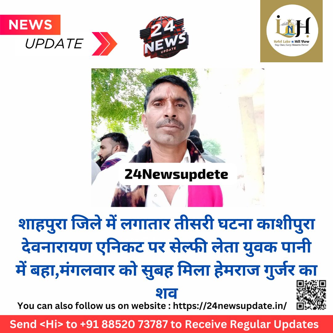 24 न्यूज़ अपडेट शाहपुरा . फूलियाकलां क्षेत्र के में पानी में बहने की लगातार तीसरी घटना सामने आई बता दें कि जिला कलेक्टर शेखावत व ज़िला पुलिस अधीक्षक राजेश कांवट के द्वारा जिलेवासियों को अलर्ट जारी कर सूचना दे चुके हैं की किसी भी तरह तेज़ आवक पानी वाली जगह पर जानें से बचे और अपनी जान जोख़िम में मे ना डालें उसके बावजूद जनता अपनी जान जोख़िम में डाल रहे हैं कभी सेल्फी लेने कभी पिकनिक मनाते हुए वीडियो व फ़ोटो डाल रहे हैं सोशल मीडिया पर डाल रहे हैं बता दें मामला डोहरिया ग्राम पंचायत के काशीपुरा स्थित देवनारायण एनिकट में रविवार को 40वर्षीय हेमराज पुत्र कान्हा गुर्जर पानी में बह गया।वहीं तीन दिन पूर्व नाहर सागर बांध में बहे युवक का शव को सोमवार को सुबह निकाला गया।उससे पहले लसाडिया पंचायत का रहने वाला दिलीप भील मीणा की कोटड़ी नाले में बह गया था जो 8दिन बाद कैकड़ी जिले के गोरधा बांध के पास मिला वहीं सोमवार को दोपहर में काशीपुरा निवासी हेमराज देवनारायण के जुलूस में शामिल होने के लिए नहाने एनिकट पर गया था।इस दौरान सेल्फी लेते समय उसका पैर फिसल गया और एनिकट में में बह गया।ग्रामीणों ने बताया कि हेमराज नहाने के दौरान सेल्फी ले रहा था।एनिकट में पानी का बहाव तेज होने से संतुलन बिगड़ गया और वह उसमें बह गया। घटना के बाद से ही तलाश जारी परन्तु आज़ मंगलवार सुबह काशीपुरा निवासी हेमराज गुर्जर, एसडीआरएफ की टीम भीलवाड़ा ने लगभग तीन घंटे सर्च अभियान चलाकर ढूंढ निकाला युवक को घटनास्थल से एक से डेढ़ किलोमीटर दूर मिला हेमराज का शव,तहसीलदार अनिल चौधरी, सरपंच सत्यप्रकाश बैरवा सहित पुलिस जाब्ता रहा मौजूद
