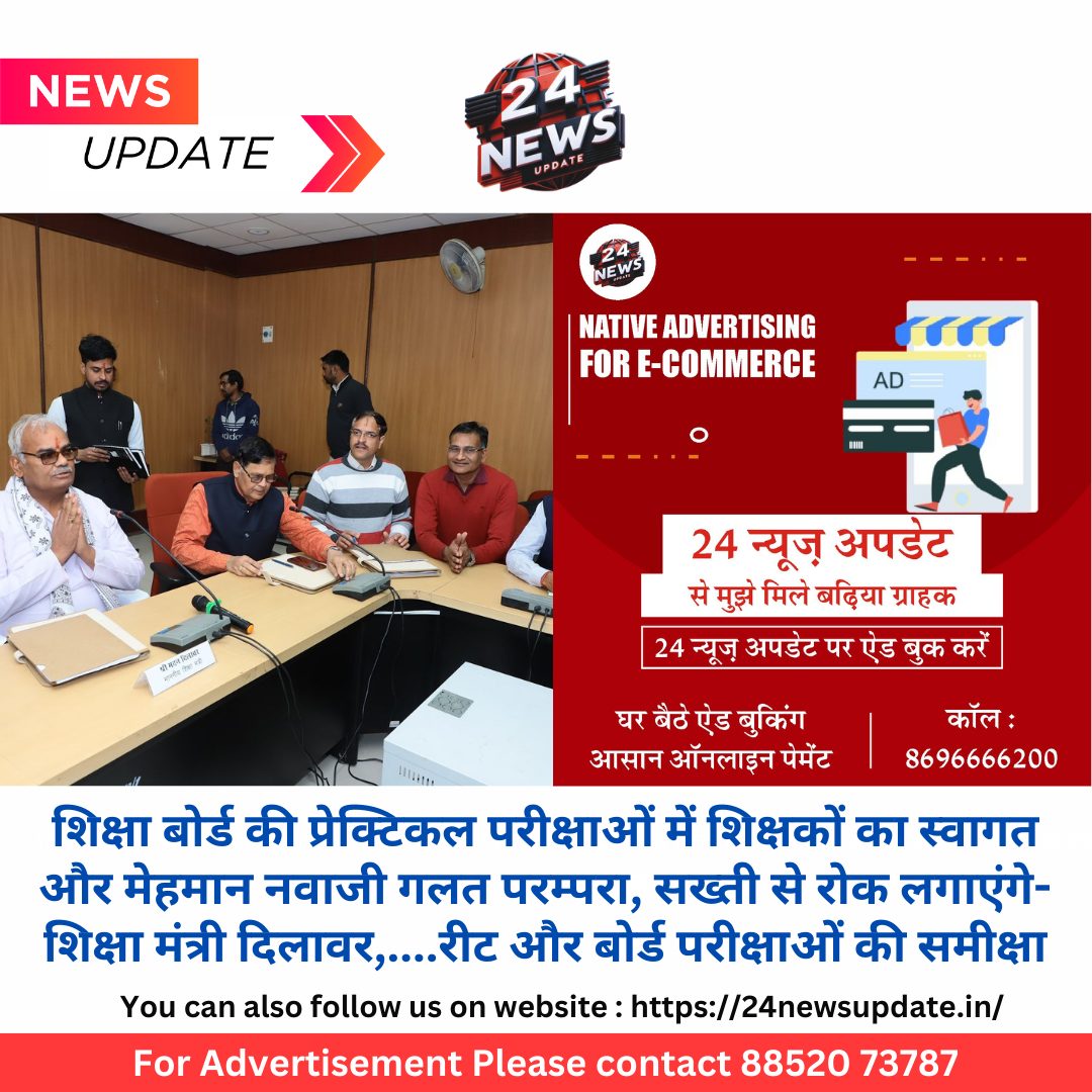 24 न्यूज़ अपडेट जयपुर। शिक्षा एवं पंचायती राज मंत्री श्री मदन दिलावर ने कहा कि बोर्ड परीक्षाओं में प्रैक्टिकल परीक्षा लेने जाने वाले शिक्षकों का स्वागत एवं मेहमान नवाजी करवाना गलत परम्परा है। इस पर सख्ती से रोक लगाएंगे। उन्होंने कहा कि रीट एवं बोर्ड परीक्षाओं में गोपनीयता, पारदर्शिता एवं सुरक्षा बेहद जरूरी है। इसके लिए हरसंभव कदम उठाये जाएंगे। राजस्थान बोर्ड की पूरे देश में साख है। यह साख बरकरार रहनी चाहिए। परीक्षाओं में किसी भी स्तर पर लापरवाही बर्दाश्त नहीं की जाएगी।