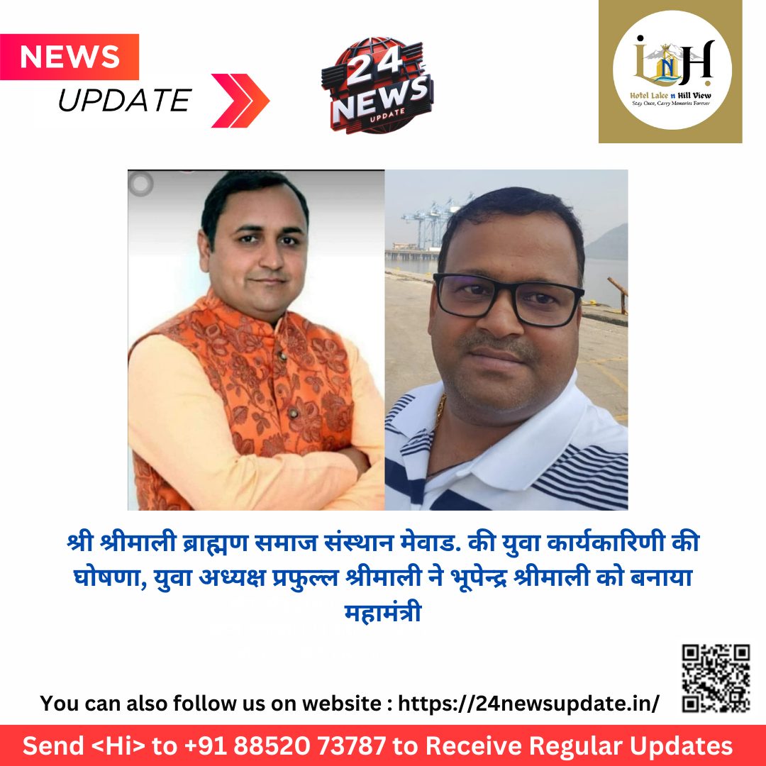 24 न्यूज अपडेट. उदयपुर। श्री श्रीमाली ब्राह्मण समाज संस्था मेवाड की युवा कार्यकारिणी की घोषणा हुई। युवा अध्यक्ष प्रफुल्ल श्रीमाली ने युवा कार्यकारिणी की घोषणा करते हुए महामंत्री पद पर भूपेन्द्र श्रीमाली को जिम्मेदारी दी। राजसमन्द जिला ईकाई का युवा जिलाअध्यक्ष सुभाष श्रीमाली को बनाया। कार्यकारिणी की घोषणा मेवाड संस्था के अध्यक्ष दिग्विजय श्रीमाली एवं राजसमन्द जिले के अध्यक्ष लोकेश श्रीमाली की अनुशंसा पर की गई। प्रफुल्ल श्रीमाली ने बताया कि श्रीमाली समाज के युवाओं की भागीदारी को बढाने के उदृदेश्य से समुचे मेवाड अंचल के युवा समाजजन को कार्यकारिणी में शामिल किया गया है। इस कार्यकारिणी के मार्फत युवाओं को समाज हित में कार्य करने के लिये प्रेरित किया जायेगा और समाज में होने वाले कार्यक्रमों में भी युवाओं की सहभागिता बढाई जायेगी। प्रफुल्ल श्रीमाली ने अपनी कार्यकारिणी में महामंत्री भुपेन्द्र श्रीमाली को बनाने के अलावा उपाध्यक्ष पद पर उदयपुर के राजेश श्रीमाली, कमल श्रीमाली, ऋषि त्रिवेदी और चित्तोडगढ के कमलेश दवे को जिम्मेदारी दी है। युवा कार्यकारिणी में मंत्री पद पर उदयपुर के विशाल दशोत्तर, राजसमन्द के प्रवीण श्रीमाली, कृष्ण गोपाल श्रीमाली और कैलाश श्रीमाली की नियुक्ति की गई है। प्रफुल्ल श्रीमाली ने अपनी कार्यकारिणी में राजसमन्द के नेडच से विनय श्रीमाली को खेलमंत्री और कांकरोली के भावेश श्रीमाली को संगठन मंत्री के पद की जिम्मेदारी दी हैं। उदयपुर के एडवोकेट दुर्गेश जोशी को विधि सलाहकार और कपिल श्रीमाली को मीडिया प्रभारी, बेदला के भरत श्रीमाली को साहित्यिक एवं सांस्कृतिक मंत्री, कुलदीप दुर्गावत को कोषाध्यक्ष और महोहरपुरा के महेन्द्र श्रीमाली को कार्यालय मंत्री का पदभार सौंपा हैं। मेवाड अंचल के युवा अध्यक्ष प्रफुल्ल श्रीमाली ने बताया कि कार्यकारिणी में सदस्यों की भी नियुक्ति की हैं। नाथद्वारा के अश्विनी श्रीमाली, पुनावली के विशाल श्रीमाली, कानोड के राजेश त्रिवेदी, मावली के देवेन्द्र श्रीमाली, बडगॉंव के गिरेन्द्र त्रिवेदी, डाबुन से अनिल श्रीमाली, चित्तोडगढ से विशाल श्रीमाली, श्रीमाली की मादडी से प्रमोद श्रीमाली, लोसिंग से दीपक श्रीमाली, कठार से गिरिश दवे, बडगॉंव के विनोद श्रीमाली, बडगॉंव से मुकेश श्रीमाली, बागोल से सुनिल श्रीमाली, मनोहरपुरा से राजेश श्रीमाली, करोली से राष्ट्रवर्धन व्यास को युवा कार्यकारिणी में सदस्य बनाया गया हैं।
