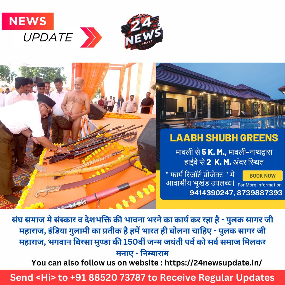 24 न्यूज़ अपडेट उदयपुर, 13 अक्टूबर। ऋषभदेव भगवान की पावन धरा पर आरएसएस का विजयादशमी उत्सव कार्यक्रम सम्पन्न हुआ, कार्यक्रम की शुरुआत मे संचलन निकला जिसमें पूर्ण गणवेश में स्वयंसेवकों ने घोष के वादन के साथ कदम से कदम मिलाकर नगर संचलन किया।नगर मे विभिन्न सामाजिक संस्थाओं, समाज के प्रबुद्ध जन, व मातृशक्ति ने जगह जगह स्वागत सत्कार किया। संचलन मे कुछ दुरी तक पूज्य राष्ट्रीय संत पुलक सागर जी गुरुदेव भी संचलन के आगे चले। संचलन टाउन हॉल मैदान से शुरू होकर नगर भ्रमण के बाद पुनः टाउन हॉल पहुंचा, जहाँ पुलक सागर जी महाराज व निम्बाराम जी क्षेत्रीय प्रचारक के द्वारा सर्वप्रथम शस्त्र पूजन हुआ, संघ के 100 वें वर्ष में प्रवेश के साथ ही प्रत्येक मंडल,व ग्राम स्तर तक शाखाओ की संख्या बढ़ाने की आवश्यकता है। शाखाओ के माध्यम से व्यक्ति निर्माण का कार्य चल रहा है, समाज मे विभिन्न सामाजिक सरोकार के कार्य को आज करने की आवश्यक्ता है।निम्बाराम जी ने कहा छुआछूत ऐसी गंभीर बीमारी है इसे खत्म कर प्रत्येक हिन्दू को गले लगाना होगा, हमें संयुक्त परिवार को बढ़ावा देना होगा,आगामी 15 नवम्बर को भगवान बिरसा मुण्डा के 150 वी जन्म जयंती वर्ष पर सभी समाज मिलकर के महापुरुष की जयंती मनाए। बिरसा मुंडा ने समाज जागरण के।लिए अपना सर्वस्व जीवन लगा दिया। अहिल्याबाई होलकर ने समाज के लिए श्रेष्ठ कार्य किया आज उनकी 350 वीं जन्म जयंती पर्व को सभी मिलकर मनाएं, उन्होंने कहा की महापुरुष किसी एक समाज के नही होते, वे सभी के होते है। अंत में उन्होंने समाज में पर्यावरण, कुटुंब प्रबोधन, नागरिक कर्तव्य, समरसता एवं स्वदेशी के विषय भी व्यक्तिगत व परिवारों में ले जाने की आवश्यकता बताते हुए कहाँ की इन पञ्च प्रण से एक सशक्त समाज और समाज से समृद्ध राष्ट्र का निर्माण होगा। उन्होंने एक गीत संस्कृति सबकी एक चिरंतन खून रगों में हिन्दू है… की पंक्ति का गान करते हुए अपने विचार रखे। समापन पर पूज्य संत पुलक सागर जी ने कहा भारत शक्तिशाली राष्ट्र बना है जिसमे संघ की बड़ी भूमिका है, देश भक्ति, अनुशासन, चरित्र व सत्यनिष्ठा स्वयंसेवकों से सीखनी चाहिए, संघ किसी पार्टी, जाति या धर्म का विरोधी नही है। प्रत्येक स्वयंसेवक के लिए राष्ट्र प्रथम है, देश के पतन का कारण संस्कृति, सभ्यता, भाषा, व संस्कार समाप्त होने से है, भारत को खतरा दुश्मनों से नहीं भारत मे रहने वाले षड़यंत्रकारी तत्वों से है, षड़यंत्रकारी शक्तियां हिन्दू समाज को जातियों मे बाटने का कुत्सित प्रयास कर रहे है । स्वयंसेवक इनकी मंशा को सफल ना होने देंगे, इंडिया गुलामी का प्रतिक है हमें भारत ही बोलना चाहिए, भारत जमीन का टुकड़ा नहीं हम सब भारत है, मै संचलन मे चला तो ऐसा लगा पूरा देश मेरे साथ चल रहा है। इस अवसर 