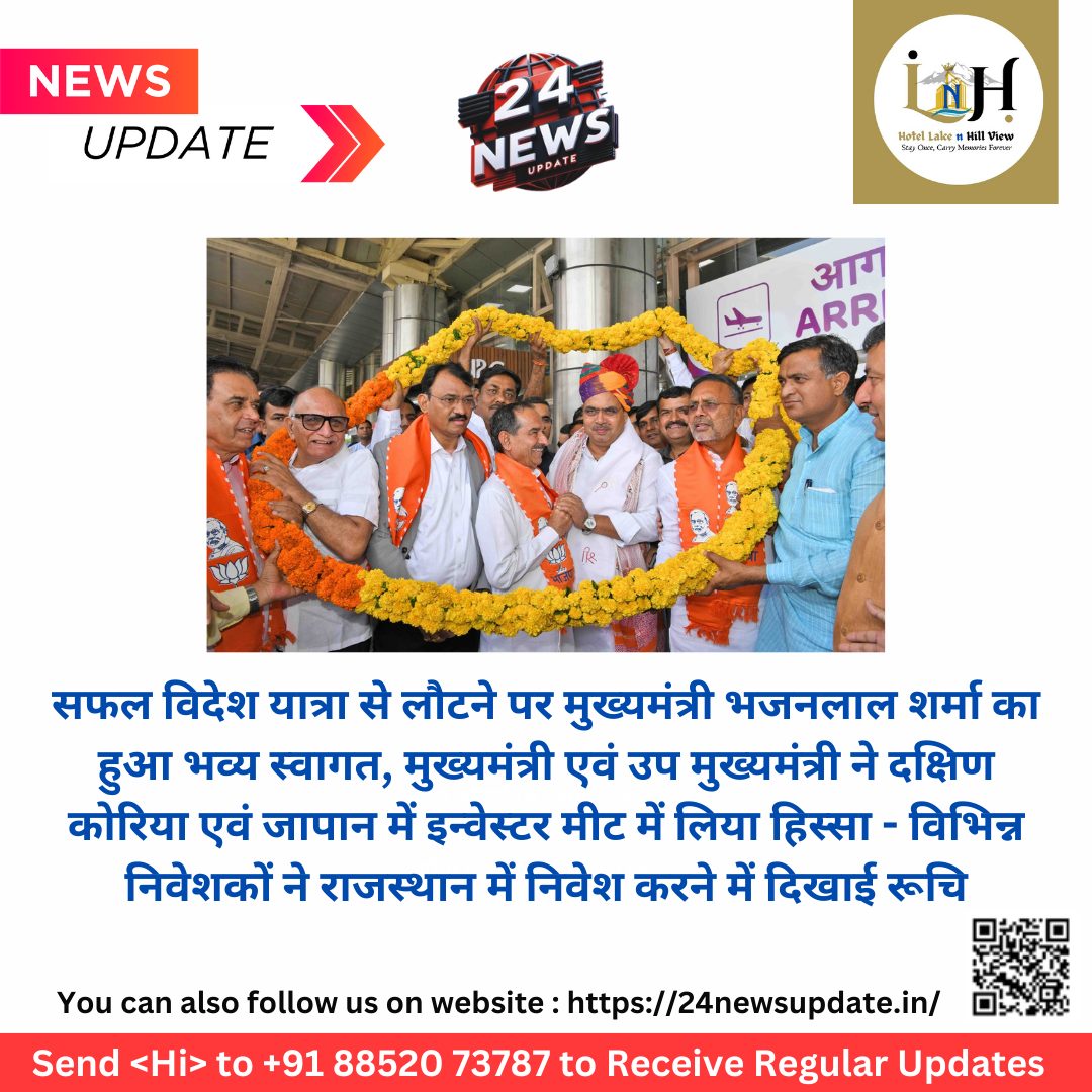 24 न्यूज़ अपडेट जयपुर। मुख्यमंत्री भजनलाल शर्मा अपनी दक्षिण कोरिया और जापान की सफल विदेश यात्रा के बाद शनिवार को उप मुख्यमंत्री डॉ. प्रेमचंद बैरवा के साथ जयपुर लौटे। श्री शर्मा के यहां पहुंचने पर जयपुर एयरपोर्ट परिसर में राज्य मंत्रीपरिषद के सदस्यों एवं विधायकों सहित उच्चाधिकारियों ने उनका भव्य स्वागत किया। मंत्रिगण और विधायकों ने मुख्यमंत्री का साफा एवं माला पहनाकर तथा पुष्पगुच्छ भेंट कर सफल विदेश यात्रा के लिए उन्हें बधाई दी।