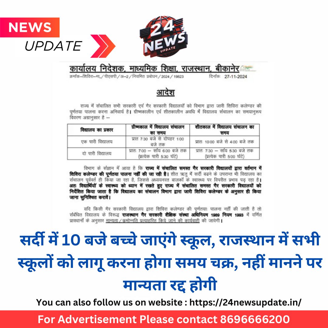 24 न्यूज अपडेट उदयपुर। शिक्षा विभाग की ओर से आदेश जारी किया गया है। इसमें राजस्थान के सभी सरकारी और प्राइवेट स्कूल (राजस्थान माध्यमिक शिक्षा बोर्ड से संबद्ध) को एक ही समय चक्र में संचालित करने के आदेश दिए हैं। सभी स्कूल एक साथ शुरू होंगे और एक ही समय पर सबकी छुट्टी होगी। अगर कोई आदेशों की अवहेलना करेगा, तो कार्रवाई की जाएगी। मान्यता रद्द की जा सकती है। माध्यमिक शिक्षा निदेशक आशीष मोदी ने बुधवार देर रात करीब 10 बजे यह आदेश जारी किए गए हैं। माध्यमिक शिक्षा निदेशक की ओर से जारी आदेश में कहा गया है कि सर्दी के समय में एकल पारी स्कूल सुबह 10 बजे से शाम 4 बजे तक ही चलेंगे। इसके अलावा दो पारी वाले स्कूल सुबह साढ़े 7 से शाम साढ़े 5 बजे तक चलेंगे। दो पारी वाले स्कूल की प्रत्येक पारी सर्दी में 5 घंटे की ही रहेगी। गर्मी में सभी एक पारी के स्कूल सुबह साढ़े 7 से दोपहर 1 बजे तक संचालित होंगे। दो पारी वाले स्कूल सुबह 7 से शाम 6 बजे तक संचालित होंगे। दो पारी वाले स्कूलों में गर्मी में प्रत्येक पारी साढ़े 5 घंटे की होगी। दो पारी वाले स्कूलों में सर्दी में आधा घंटे कम पढ़ाई होगी। बताया गया कि विभाग के ध्यान में आया है कि राज्य में संचालित गैर सरकारी स्कूल शिविरा (शैक्षणिक) कैलेंडर को पूरी तरह पालन नहीं कर रहे हैं। सर्दी बढ़ने के बाद भी स्कूलों का संचालन सुबह जल्दी किया जा रहा है। इससे स्टूडेंट्स के स्वास्थ्य पर असर पड़ रहा है। अगर कोई प्राइवेट स्कूल कैलेंडर का पालन नहीं करता है तो संबंधित स्कूल के खिलाफ राजस्थान गैर सरकारी शैक्षिक संस्था अधिनियम के तहत कार्रवाई की जाएगी। स्कूलों की मान्यता व क्रमोन्नति भी रद़्द की जा सकती है।