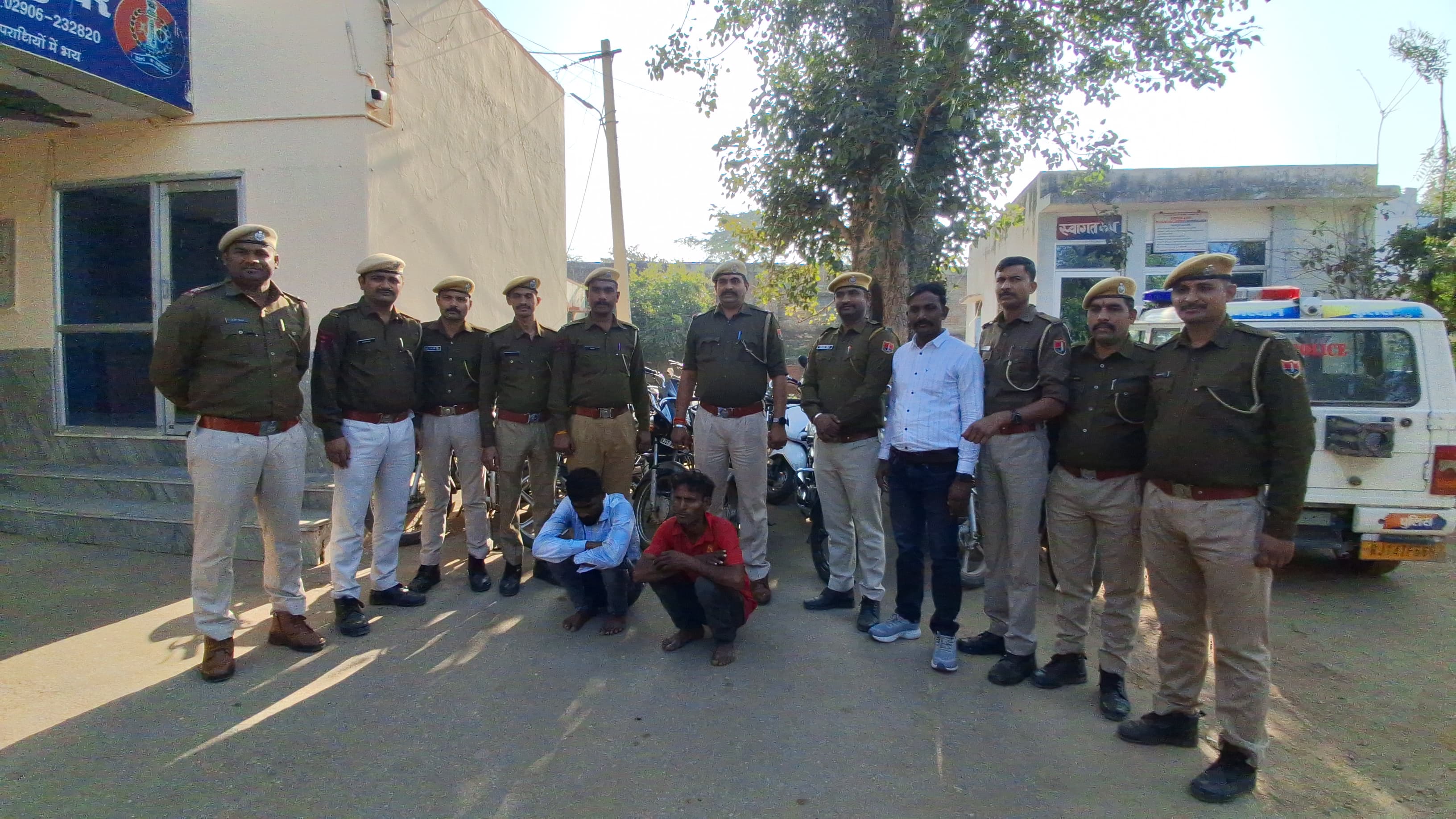 सलुम्बर थाना पुलिस ने बाईक चोरी वारदातो का खुलासा करते हुए 2 आरोपीयो को गिरफतार कर चोरी की गई 24 बाईक बरामद किए हैं। जिला पुलिस अधीक्षक राजेश कुमार यादव ने बताया कि जिले मे मोटरसाईकिल चोरी की बढ़ती घटनाओ को लेकर बाईक चोरी की वारदातो का पर्दाफाश करने के लिये जिले के थानाधिकारियो को विशेष दिशा निर्देश दिये गये थे । जिस पर थानाधिकारी मनीष खोईवाल के नेतृत्व में थाना सलुम्बर एक विशेष टीम का गठन किया गया। टीम द्वारा निरन्तर बाइक चोरी की वारदातो की गंभीरता को देखते हुए घटनास्थल का निरक्षण कर घटनास्थल के आसपास के 100 से अधीक स्थानो के सीसीटीवी फुटेज व सदिग्धो के आने जाने वाले मार्गो के सीसीटीवी फुटेज खंगाले गये टीम द्वारा अथक प्रयास से संदिग्धो से पुछताछ करते हुए सम्पत्ति सबंधित अपराधो मे चालानशुदा अपराधीयो पर विशेष निगरानी रखते हुए अपराधीयो की गतिविधीयो के बारे मे जानकारी प्राप्त करते हुए सदिग्ध की तलाश की टीम द्वारा अथक प्रयास से एक बदमाश को डिटेन कर मनोवैज्ञानिक तरिके से पुछताछ की गई जिस पर शातिर बदमाश द्वारा सलुम्बर, उदयपुर, बांसवाडा, केसरियाजी आदी स्थानो पर मौज शोक करने हेतु अलग अलग स्थानो से बाईक चोरी की वारदात करना कबुल किया गया । शांतिर अभियुक्त से अलग अलग स्थानो से चोरी की गई 24 मोटर साईकिल बरामद की गई है । वही आरोपी दिनेश पिता हुका मीणा उम्र 31 साल निवासी साईयत फला भोराई पाल थाना सेमारी व कांतिलाल पिता शिवलाल मीणा उम्र 34 साल निवासी सुरो का कुंआ को गिरफ्तार किया है ।