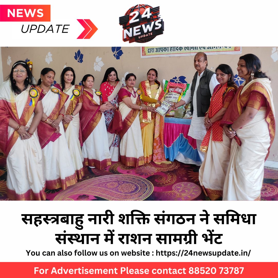 24 न्यूज़ अपडेट उदयपुर। सहस्त्रबाहु नारी शक्ति संगठन उदयपुर ने समिधा संस्थान को राशन सामग्री भेंट की। सचिव मधुबाला जायसवाल ने बताया कि नवीन कार्यकारिणी ने प्रथम सेवा कार्य में समिधा संस्थान सेक्टर 14 में अंधे बालको के लिए संचालक चन्द्र गुप्त सिंह चौहान को राशन सामग्री भेंट की। अध्यक्ष निर्मला जायसवाल, सचिव मधुबाला जायसवाल,सपना टांक, अंजलि टांक व अन्य सदस्यों द्वारा आर्थिक सहयोग किया। राशन सामग्री मे आटा,दाल, शक्कर,चाय पत्ती, मिर्च, धनिया, हल्दी, बेंसन,नमक,सुजी,तेल,घी,राजमा,जीरा व पौहा भेंट किया
