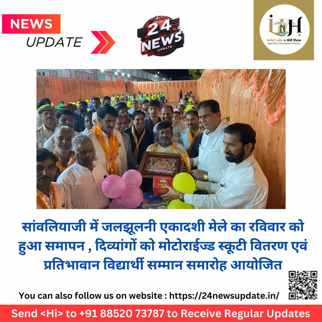 24 न्यूज़ अपडेट चित्तौड़गढ़। जिले में मंडफिया स्थित कृष्णधाम श्री सांवलियाजी मंदिर में भगवान सांवलिया सेठ के विशाल जलझूलनी एकादशी मेले का रविवार समापन हुआ। मेला ग्राउंड, मीरा रंग मंच स्टेज पर आयोजित समापन समारोह में 50 दिव्यांगों को मोटोराईज्ड स्कूटी वितरण की गई एवं 16 गांवों के मेधावी विद्यार्थियों को 15 हजार रूपए प्रति छात्र राशि एवं प्रमाण पत्र प्रदान किए गए । इस अवसर पर निंबाहेड़ा विधायक श्रीचंद कृपलानी, कपासन विधायक अर्जुन लाल जीनगर, सांवरिया जी मंदिर बोर्ड के अध्यक्ष भेरुलाल गुर्जर, बोर्ड के सदस्य एवं जनप्रतिनिधि उपस्थित रहे।