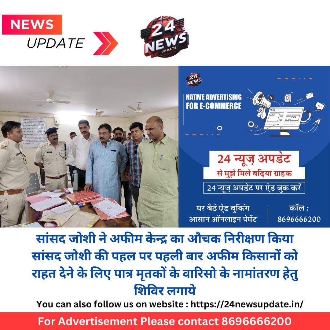 24 न्यूज़ अपडेट निम्बाहेडा। बुधवार को सांसद सीपी जोशी ने जिला अफीम केन्द्र पर नारकोटिक्स विभाग में अफीम लाईसेंस आवेदन एवं नामांतरण व मृतक पात्र अफीम कृषकों के वारिसो के नाम पर नामांतरण हेतु आयोजित शिविर का औचक निरीक्षण किया। भाजपा जिला मीडिया प्रभारी मनोज पारीक ने बताया कि सांसद जोशी की पहल पर पहली बार अफीम किसानों को राहत देने के लिए पात्र मृतकों के वारिसो के नामांतरण हेतु शिविर लगाकर नवाचार हुआ। शिविर के निरिक्षण के दौरान सांसद जोशी ने अधिकारियों को नामांतरण की कार्यवाही में कोताही नहीं बरतने, पारदर्शिता रखने एवं किसानों को फार्म भरते समय पुरा पुरा सहयोग करने के निर्देश दिए। साथ ही किसानों की समस्याओं को लेकर अधिकारियों को आवश्यक दिशा निर्देश दिये । किसानों से किसी भी प्रकार की अनियमितता एवं समस्या या अन्य कोई परेशानी होने पर मुख्य कारखाना नियंत्रक, दिल्ली, भ्रष्टाचार निरोधक ब्यूरो, जयपुर, नारकोटिक्स ब्यूरो, कोटा, नारकोटिक्स ब्यूरो, ग्वालियर को सुचित करने का आग्रह किया। जोशी ने अफीम किसानों से उनकी परेशानियां पूछी,साथ ही मंत्रालय और केंद्रीय नारकोटिक्स ब्यूरो से किसानों को उनकी समस्याओं का समाधान करने का भी आश्वासन दिया । जोशी ने नई अफीम निति जारी होने पर हर्ष व्यक्त किया। इस दौरान संभाग सह मीडिया प्रभारी सुधीर जैन, पूर्व भाजयुमो जिलाध्यक्ष हर्षवर्धन सिंह रूद, पूर्व भाजयुमो नगर अध्यक्ष गौरव त्यागी उपस्थित रहे। इस दौरान चित्तौड़गढ़ संसदीय क्षेत्र के अफीम उत्पादक किसानों ने नई अफीम नीति अफीम पट्टे मिलने पर सांसद सी पी जोशी और प्रधानमंत्री नरेन्द्र मोदी,केंद्रीय वित्त मंत्री निर्मला सीतारमण का आभार व्यक्त करते हुए पहली बार ऐसे कैंप आयोजित करने के लिए सांसद सी पी जोशी का विशेष आभार जताया।