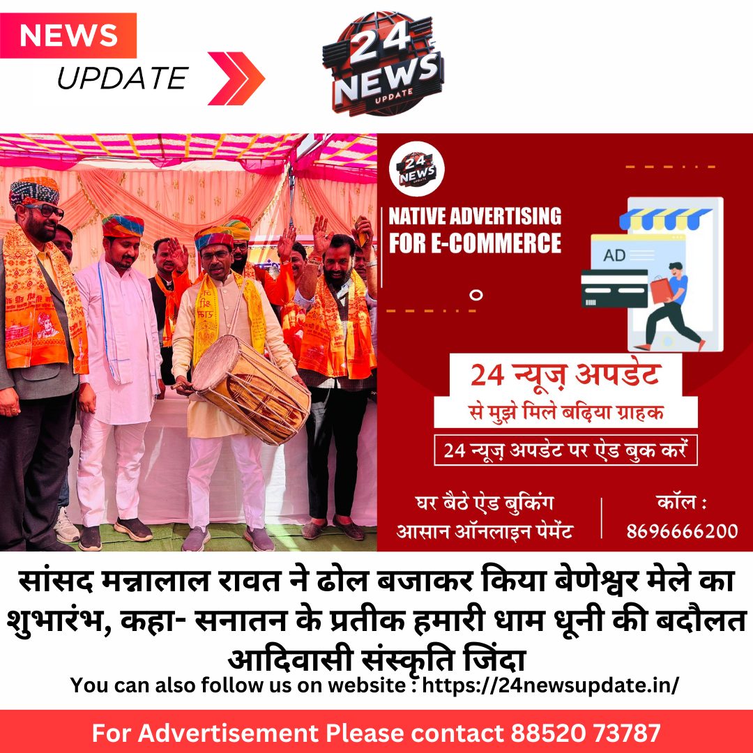 24 न्यूज़ अपडेट उदयपुर। आदिवासियों का प्रमुख महाकुंभ और वागड प्रयागराज बेणेश्वर धाम मेले का शनिवार को मुख्यअतिथि उदयपुर सांसद डॉ मन्नालाल रावत ने ढोल बजाकर शुभारंभ किया। इस मौके पर बडी संख्या जनजाति समुदाय के लोग व जनप्रतिनिधि उपस्थित रहे।