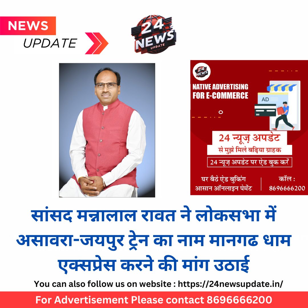 24 न्यूज अपडेट उदयपुर। उदयपुर लोकसभा सांसद मन्नालाल रावत ने बुधवार को लोकसभा में असावरा से जयपुर तक चलने वाली ट्रेन का नाम बदलकर मानगढ धाम एक्सप्रेस करने की मांग उठाई है।