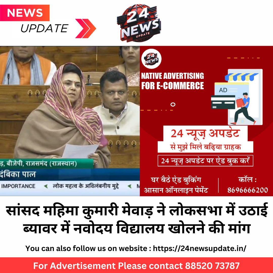 24 न्यूज़ अपडेट राजसमंद/नई दिल्ली। लोकसभा में शून्यकाल के दौरान सभा की कार्यवाही में भाग लेते हुए माननीय राजसमंद सांसद श्रीमती महिमा कुमारी मेवाड़ ने ब्यावर में जवाहर नवोदय विद्यालय खोलने की मांग पुरजोर ढंग से उठाई।
