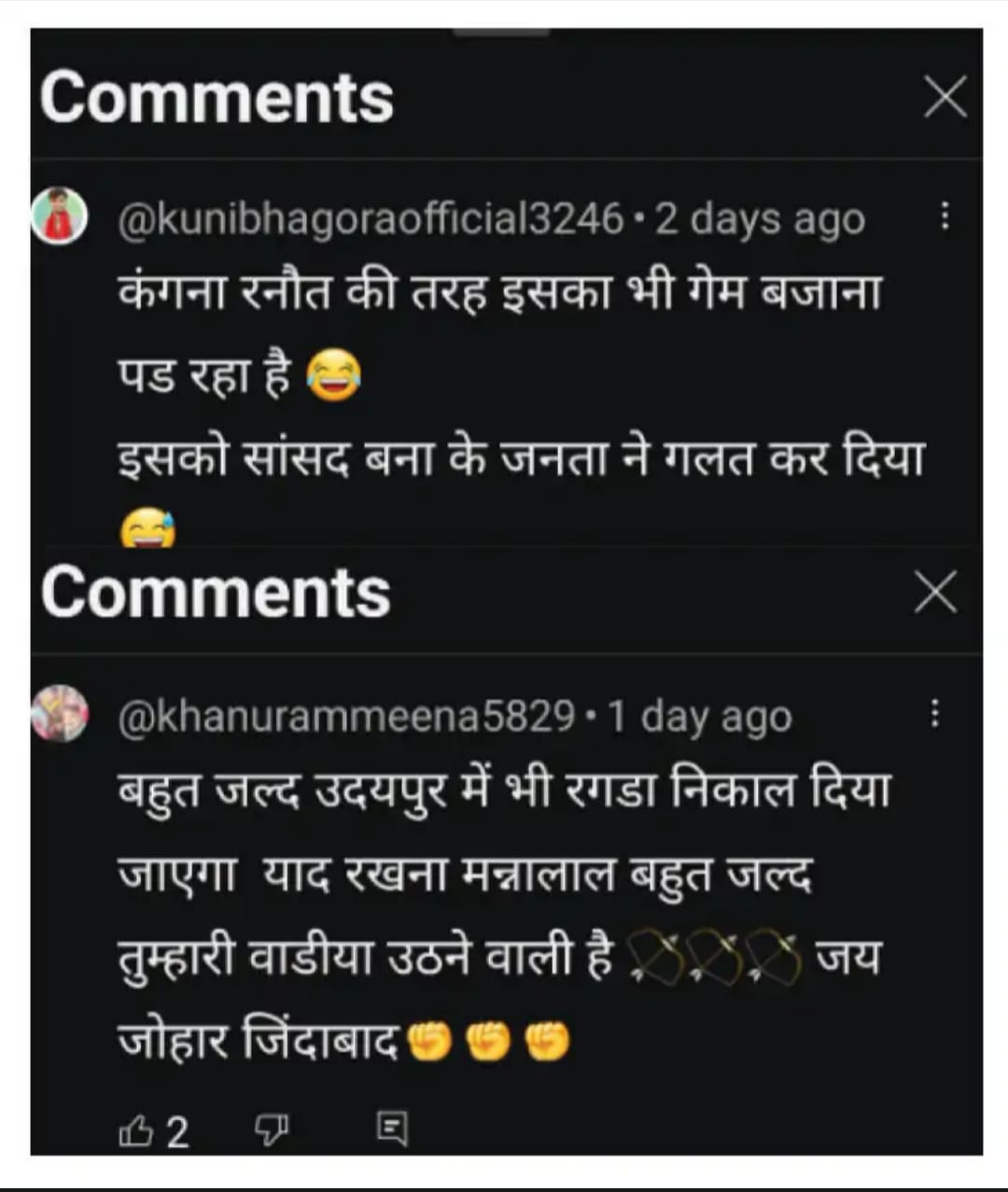 उयपुर। भाजपा उदयपुर देहात का कहना है कि सोशल मीडिया पर राजस्थान सरकार के मंत्री तथा झाड़ोल विधायक बाबू लाल खराड़ी को जान से मारने की धमकी के बाद उदयपुर निर्वाचित सांसद मन्नालाल रावत को जान से मारने की धमकी भविष्य के लिए बहुत ही गंभीर खतरा है व धमकी देने वालों के खिलाफ कठोर कार्यवाही होने ही चाहिएं जिलाध्यक्ष डा चंद्रगुप्त सिंह चौहान ने इस बारे में उदयपुर एसपी से फोन पर बात की और तत्काल गिरफ्तारी की मांग की। जिलाध्यक्ष डा चंद्रगुप्त सिंह चौहान,भाजपा जिला उपाध्यक्ष अणदाराम गरासिया, चंद्रशेखर जोशी,राम कृपा शर्मा,जिला महामंत्री नाना लाल अहारी,नरेंद्र सिंह आसोलिया,दीपक शर्मा ,जिला मंत्री अमित कलाल,रमेश जोशी आदि पदाधिकारियों ने कहा की लगातार धमकी देने ,समाज को आतंकित करने का ट्रेंड विगत दो तीन वर्षो में मेवाड़ वागड़ में बढ़ गया हे । कुछ आसामाजिक तत्व एक विशेष राजनीतिक विचारधारा और विचारो से भ्रमित और प्रेरित होकर लगातार समाज को भडक़ाने ,आतंकित करने ओर हिंसक गतिविधियों को प्रोत्साहित करने की मंशा पाल आदिवासी बाहुल्य के क्षेत्र के आदिवासियों को बरगलाने का काम कर रहे हे और अब ये जनप्रतिनिधियों को सीधे टार्गेट कर रहे हे । ऐसे समाज कंटको के खिलाफ राष्ट्रीय सुरक्षा कानून (एनएसए) के तहत कार्यवाही कर कड़ा संदेश देना जरूरी हो गया है।जिला अध्यक्ष डा चंद्रगुप्त सिंह चौहान ने कहा की वे इस संबंध में राजस्थान के मुख्यमंत्री से बात कर ऐसे उदयपुर में पनप रही अराजक और अलगाववादी ताकतों को रोकने के लिए रासुका की मांग करेंगे । भाजपा जिला उपाध्यक्ष चंद्रशेखर जोशी ने कहा की धमकी देने वाले युवकों के बांसवाड़ा सांसद राजकुमार रोत, धरियावद और आसुपुर विधायक के साथ फोटो सोशल मीडिया में पोस्ट युवकों द्वारा किए गए हैं। उनकी सोशल मीडिया की पोस्टें भी उनकी पार्टी की विचारधारा से प्रेरित हे