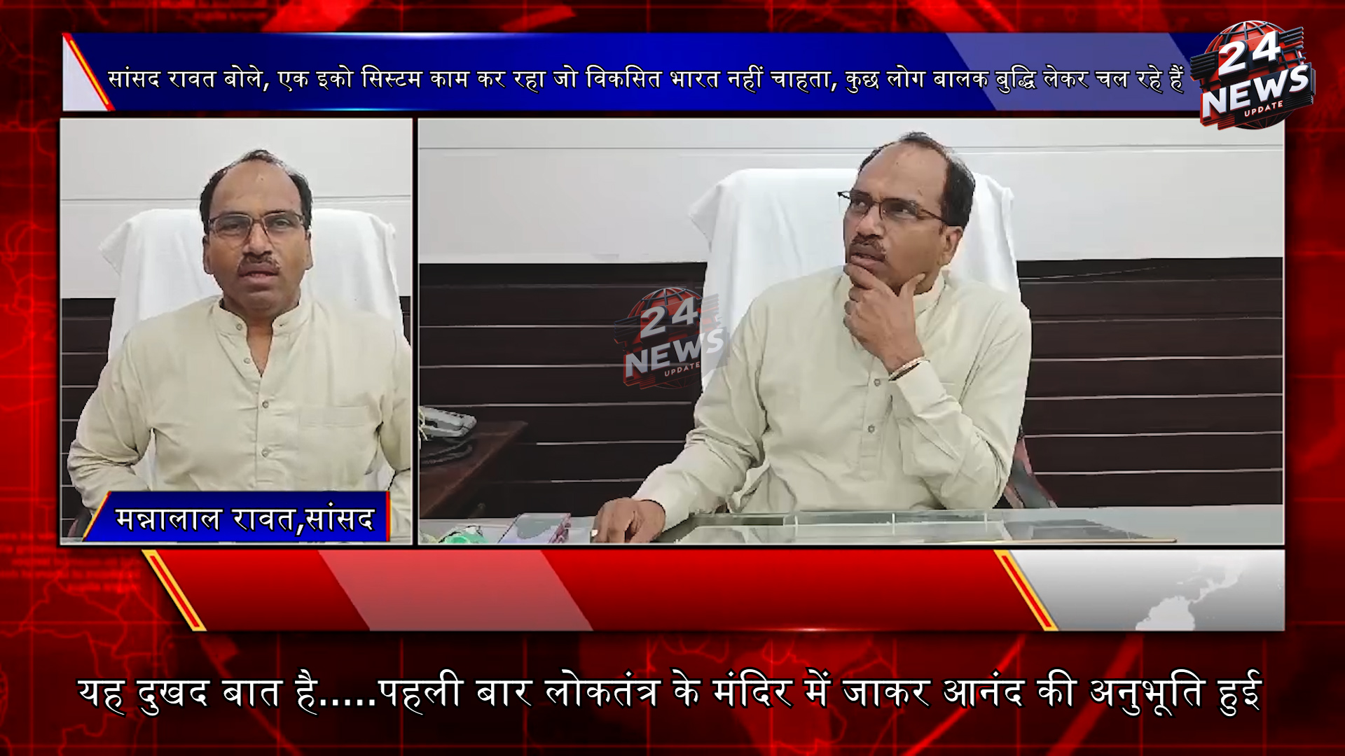 24 न्यूज अपडेट उदयपुर. नवनिर्वाचित सांसद मन्ना लाल रावत दिल्ली लोकसभा में शपथ ग्रहण करने बाद अपने संसदीय क्षेत्र उदयपुर पहुंचे , रावत आज सुबह उदयपुर जिला परिषद में स्तिथ अपने कार्यालय में जनसुनवाई ।सांसद रावत मीडिया से मुख़ातिफ़ हुए कहा कि भारत के सबसे बड़े लोकतंत्र के मंदिर में जाने मात्र से ही गौरव कीअनुभूति होती है सांसद ने पूरी लोकसभा क्षेत्र और पार्टी के कार्यकर्ता और पदाधिकारियों को धन्यवाद ज्ञापित किया। और क्षेत्र की हर समस्या को मज़बूती के साथ सदन में उठाने का भरोसा दिलाया।देश की बड़ी कल्याणकारी नीतियाँ , योजना और निर्णय को कैसे धरातल पर उतारा जाता है ।ऐसे अनुभवों से अभिभूत होने की भी बात कही। Share this: Share on X (Opens in new window) X Share on Facebook (Opens in new window) Facebook More Email a link to a friend (Opens in new window) Email Share on WhatsApp (Opens in new window) WhatsApp Like this:Like Loading... Related Discover more from 24 News Update Subscribe to get the latest posts sent to your email. Type your email… Subscribe Post navigation फूलसिंह मीणा ने आज विधानसभा में प्रश्न संख्या 469 में जीबीएच अमेरिकन हॉस्पिटल के बारे में ऐसा क्या पूछा कि पूरा सदन……..देखें पूरा वीडियो नीट पेपरलीक के खिलाफ यूथ कांग्रेस का हल्लाबोल, रेल रोकने का प्रयास, पुलिस से धक्का-मुक्की