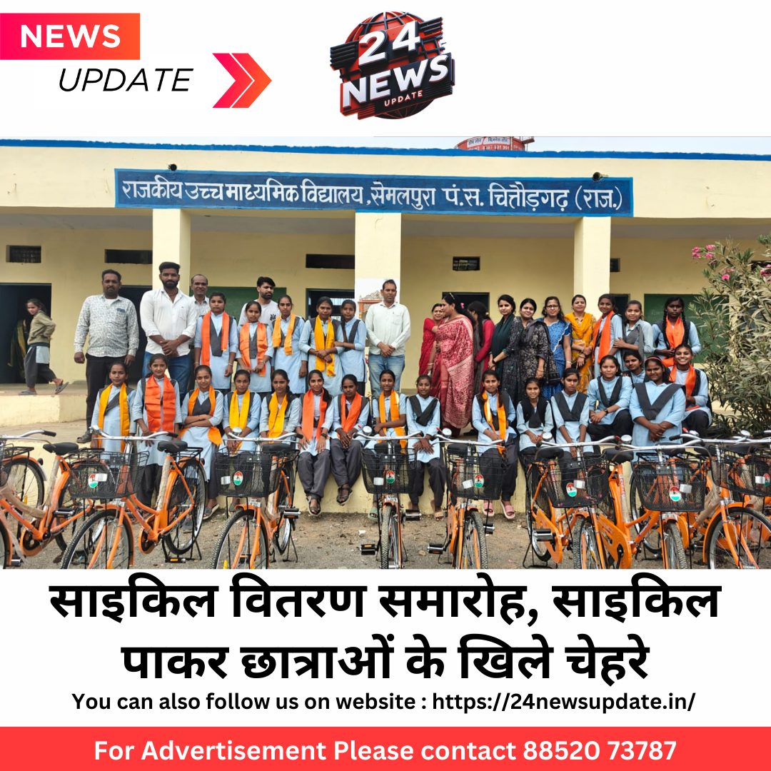 24 न्यूज़ अपडेट चित्तौड़गढ़, 24 फरवरी। राज्य सरकार द्वारा छात्राओं को निशुल्क साइकिल वितरण योजना के तहत राजकीय उच्च माध्यमिक विद्यालय सेमलपुरा की कक्षा 8 में अध्ययनरत 31 छात्राओं को साइकिल वितरित की गई। साइकिल पाकर छात्राओं के चेहरों पर खुशी और उत्साह की लहर देखी गई। यह योजना छात्राओं के लिए एक महत्वपूर्ण कदम साबित हो रही है, जो न केवल उनकी शिक्षा को प्रोत्साहित करेगी बल्कि विद्यालय आने-जाने में सहूलियत भी प्रदान करेगी।