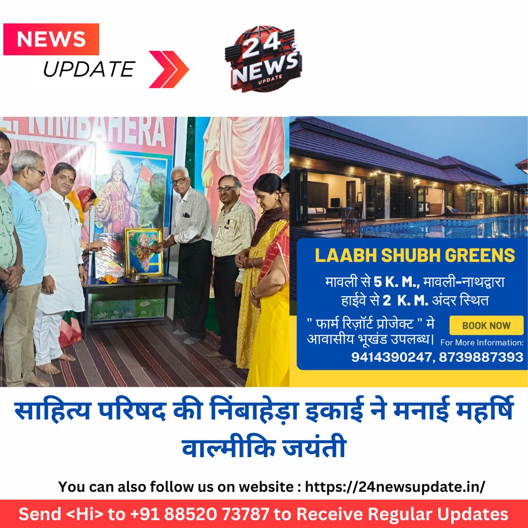 24 न्यूज़ अपडेट निम्बाहेडा। अखिल भारतीय साहित्य परिषद की निंबाहेड़ा इकाई ने महर्षि वाल्मीकि जयंती के अवसर पर गुरुवार शाम विशाल अकादमी माध्यमिक विद्यालय निंबाहेड़ा में महर्षि वाल्मीकि जयंती समारोह का आयोजन किया गया।