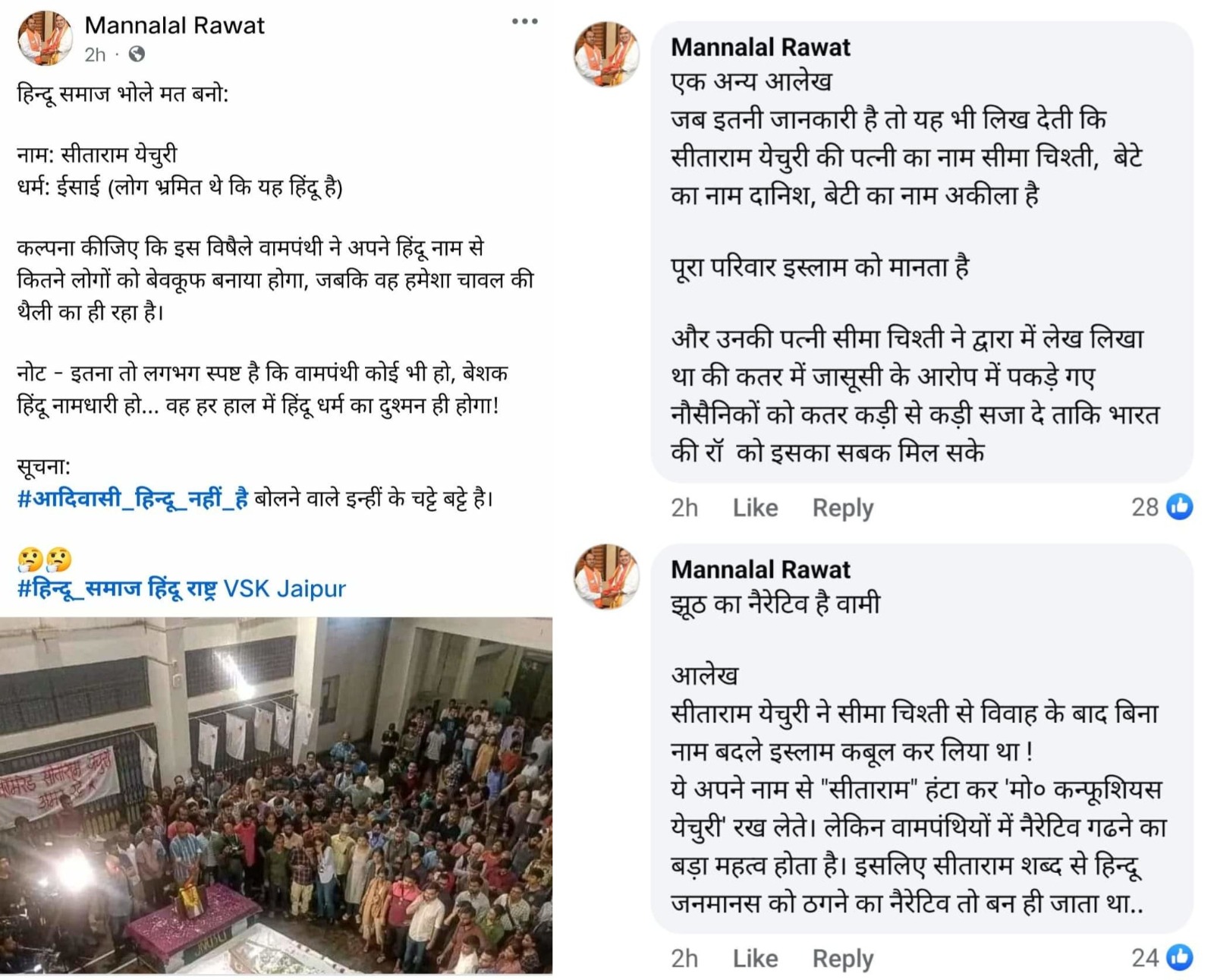 24 न्यूज अपडेट. उदयपुर। उदयपुर सांसद मन्नालाल रावत की ओर से माकपा के राष्ट्रीय महासचिव सीताराम येचुरी के निधन पर सोशल मीडिया में अपनी एक पोस्ट में उनके धर्म को ईसाई बताते हुए विषैले वामपंथी द्वारा अपने हिंदू नाम से लोगों को बेवकूफ बनाने और वामपंथी के हिंदू धर्म के दुश्मन होने तथा दूसरी पोस्ट में पूरे परिवार द्वारा इस्लाम मानने व सीमा चिश्ती से विवाह के बाद इस्लाम कबूल करने का लिखने पर माकपा जिला सचिव राजेश सिंघवी ने रावत पर धर्म के आधार पर नफरत फैलाने का आरोप लगाते हुए कहा कि रावत का धर्म जो भी हो, वह उनका व्यक्तिगत मामला है, लेकिन वे इंसानियत को मानने वाले नहीं है और नहीं जन प्रतिनिधि कहलाने लायक है।
