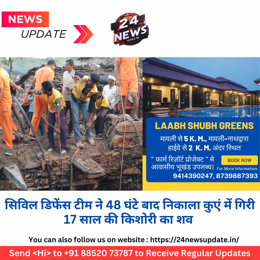 24 न्यूज अपडेट. उदयपुर। उदयपुर जिले के गोगुंदा थाना क्षेत्र के खेरावास दादिया गांव में आज दो दिन पहले कुएं में गिरी नाबालिग किशोरी का शव सिविल डिफेंस और एसडीआरएफ की टीम ने निकाला। टीम ने 48 घंटे की कड़ी मशक्कत के बाद शव को बाहर निकाला। टीम ने शव को पुलिस के सुपुर्द किया। बालिका का नाम 17 वर्षीय मीना गमेती पु़त्री हुकम चंद गमेती है। बताया गया कि जिस बिना मुंडेर के कुएं में बालिका गिरी वह मृतका के घर के पास ही है। शाम को यह किशोरी अपनी दो अन्य सहेलियों के साथ जा रही थी तब पैर फिसला गया और कुएं में गिर गई। रविवार को उसके चप्पत तैरते नजर आए थे। कुएं की गहराई 150 फीट थी व उसमें से बदबू आ रही थी। इकसे बाद पानी खाली करने के लिए कुएं में तीन मोटरें लगाई गई। सिविल डिफेंस और एसडीआरएफ टीम ने का अभियान उसी समय शुरू हो गया मगर लड़की का शव नहीं मिला। कल रात होने से अभियान को रोका गया था। आज सुबह फिर अभियान शुरू किया गया व सफलता मिली। टीम में वाहन चालक दिनेश खटीक गोताखोर मनोज जीसी भवानी शंकर वाल्मीकि नरेश चौधरी मुकेश सेन जगदीश सिंह दुलावत लाल सिंह झाला कैलाश गमेती मौजूद थे। Share this: Share on X (Opens in new window) X Share on Facebook (Opens in new window) Facebook More Email a link to a friend (Opens in new window) Email Share on WhatsApp (Opens in new window) WhatsApp Like this:Like Loading... Related Discover more from 24 News Update Subscribe to get the latest posts sent to your email. Type your email… Subscribe Post navigation मिहिरभोज, रणपुंजा , प्रथ्वीराज चौहान सहित विभिन्न क्षत्रिय यौद्धाओं के इतिहास को विकृत नहीं होने देने का संकल्प, मेवाड़ राजवंश परिवार सदस्य को अयोध्या मंदिर में ट्रस्टी बनाने की मांग के साथ दो दिवसीय वैश्विक क्षत्रिय सम्मेलन का समापन प्रकाश, आकृति ने बनाया भक्तिमय माहौल, मीरा का मेवाड़ रंगा कृष्ण के रंग में, उप महापौर सिंघवी सहित पार्षद खूब झूमे, भजन संध्या के साथ सांस्कृतिक कार्यक्रमों का समापन, मेला 4 नवंबर तक रहेगा यथावत