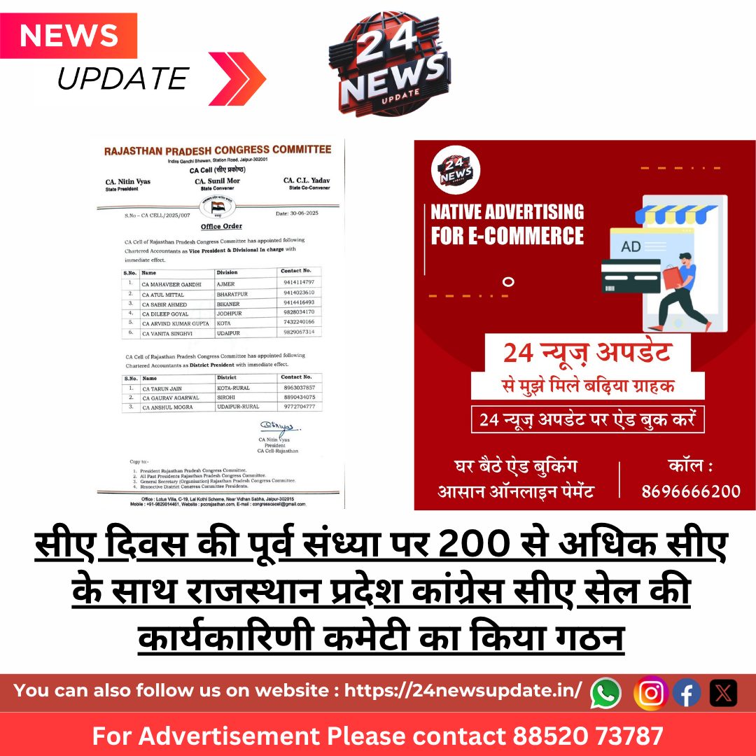 24 न्यूज अपडेट, जयपुर। राजस्थान प्रदेश कांग्रेस कमेटी के चार्टर्ड अकाउंटेंट (सीए) प्रकोष्ठ ने प्रदेश में अपनी सांगठनिक मजबूती और विस्तार को लेकर अहम कदम उठाया है। इसी क्रम में प्रदेश के विभिन्न संभागों और जिलों के लिए चार्टर्ड अकाउंटेंट्स की नियुक्ति की गई है, जो पार्टी के वित्तीय मामलों, नीतिगत मार्गदर्शन और सांगठनिक सहयोग के कार्यों में अपनी भूमिका निभाएंगे। संभागीय प्रभारी और उपाध्यक्ष में सीए वनीता सिंघवी को उदयपुर, अजमेर संभाग से सीए महावीर गांधी , जबकि भरतपुर संभाग से सीए अतुल मित्तल को जिम्मेदारी सौंपी गई है। बीकानेर संभाग का प्रतिनिधित्व सीए साबिर अहमद करेंगे। जोधपुर संभाग में सीए दिलीप गोयल को यह जिम्मेदारी दी गई है। कोटा संभाग में इस पद की जिम्मेदारी सीए अरविंद कुमार गुप्ता को दी गई है।