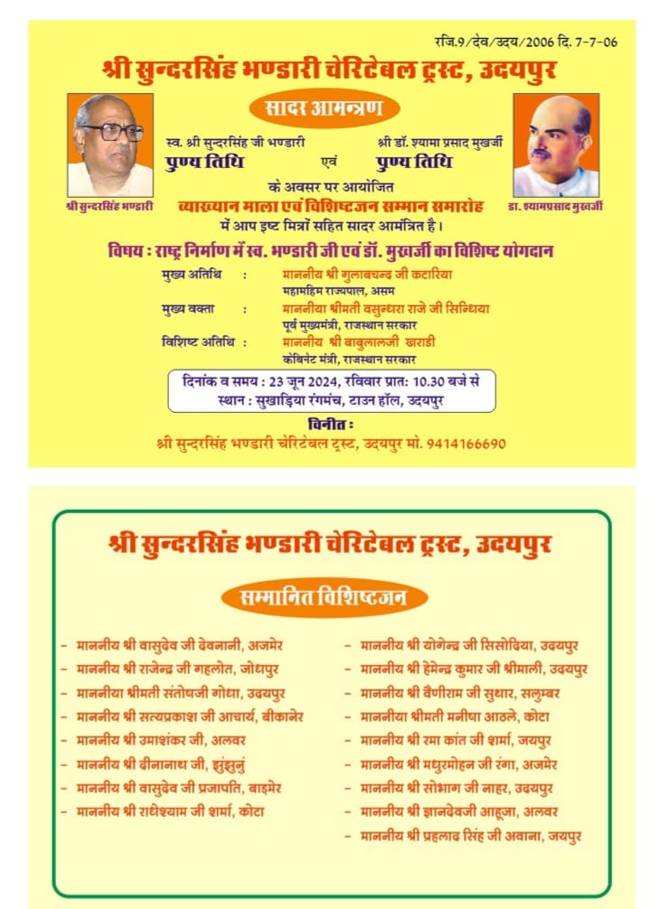 24 न्यूज अपडेट उदयपुर। सुंदर सिंह भंडारी चैरिटेबल ट्रस्ट की ओर से रविवार 23 जून को प्रातः 11 बजे नगर निगम सभागार में व्याख्यान माला एवं विशेष जन सम्मान समारोह का आयोजन किया जा रहा है। इस कार्यक्रम में असम प्रांत के महामहिम राज्यपाल गुलाबचंद कटारिया मुख्य अतिथि होंगे। वहींं कार्यक्रम की मुख्य वक्ता पूर्व मुख्यमंत्री वसुंधरा राजे सिंधिया होगी। कार्यक्रम के विषय स्थिति के रूप में कैबिनेट मंत्री बाबूलाल खराड़ी उपस्थित रहेंगे। भारतीय जनता पार्टी एवं विचार परिवार के 17 उन सदस्यों का सम्मान किया जाएगा जिन्होंने जीवन पर्यंत संगठन समाज एवं राष्ट्र की विभिन्न क्षेत्रों में सेवा की।