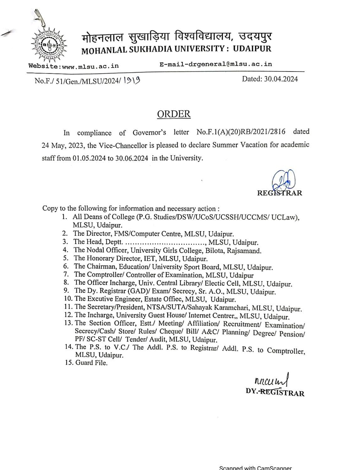 24 न्यूज अपडेट. उदयपुर। उदयपुर के मोहनलाल सुखाडिया विश्वविद्यालय में एकेडमिक स्टाफ का अवकाश 1 मई से 30 जून तक घाषित किया गया है। आज रजिस्ट्रार की ओर से यह आदेश जारी किए गए।