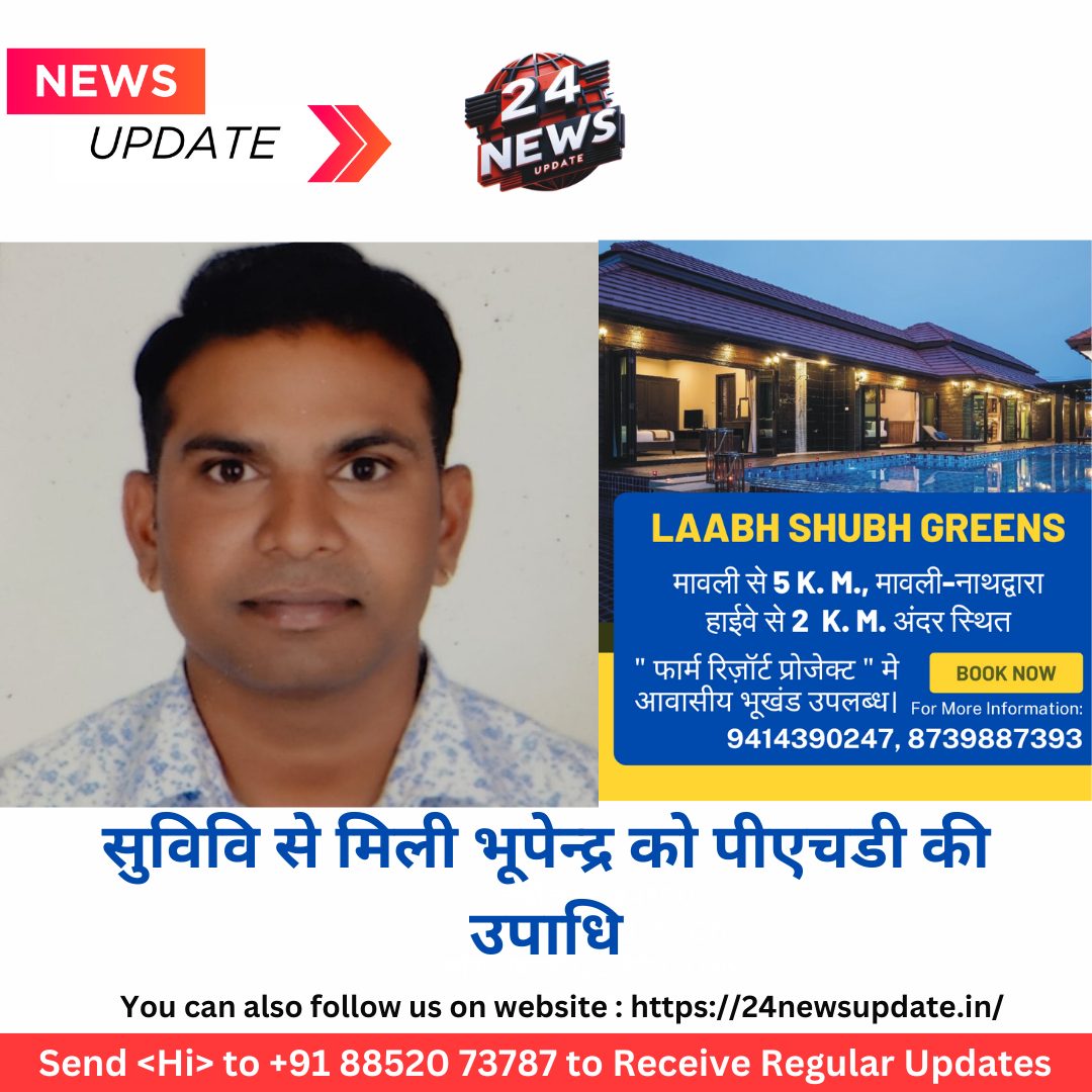 24 न्यूज अपडेट. उदयपुर। मोहनलाल सुखाड़िया विश्वविद्यालय के समाजशास्त्र विभाग के शोधार्थी भूपेन्द्र मेघवाल को विद्या वाचस्पति (च्ी. क्.) की उपाधि प्रदान की गई है। भूपेन्द्र ने ’उत्पीड़ित अनुसूचित जाति की महिलाएं तथा पारिवारिक न्यायालय की भूमिका (उदयपुर जिले का एक समाजशास्त्रीय अध्ययन)’ विषय पर शोध कार्य सामाजिक विज्ञान संकाय के अध्यक्ष और समाजशास्त्र विभाग के पूर्व विभागाध्यक्ष प्रो. पी.एम. यादव के निर्देशन में पूरा किया है ।