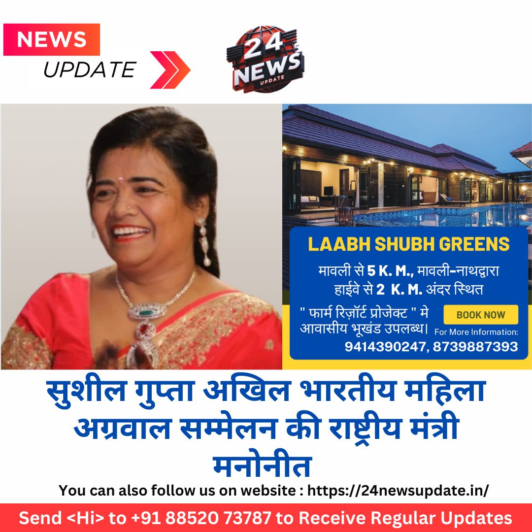 24 न्यूज अपडेट. उदयपुर। अखिल भारतीय महिला अग्रवाल सम्मेलन की राष्ट्रीय अध्यक्ष श्रीमती विनीता खेतावत ने उदयपुर जिला अग्रवाल महिला सम्मेलन की जिला अध्यक्ष एवं समाज सेवा में अग्रणी श्रीमती सुशीला गुप्ता को अखिल भारतीय महिला अग्रवाल सम्मेलन का राष्ट्रीय संगठन मंत्री मनोनीत किया है।