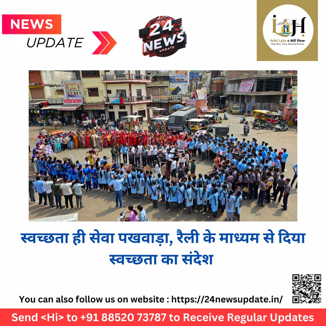 सहायक अभियन्ता सतीश ने बताया कि, केन्द्र एवं राज्य सरकार से प्राप्त निर्देशानुसार 17 सितम्बर से 02 अक्टूबर तक स्वच्छता ही सेवा पखवाडे का आयोजन किया जा रहा है, जिसके तहत सोमवार को शहर के कलैक्ट्री चौराहे से गोल प्याऊ चौराहे तक नगर परिषद कार्मिक, स्कूली बच्चे, स्वंय सहायता समूह की महिलायें, स्काउट गाइड आदि स्वच्छता का संदेष देने हेतु रैली निकाली तथा शहरवासियो को स्वच्छता के प्रति जागरूक किया।