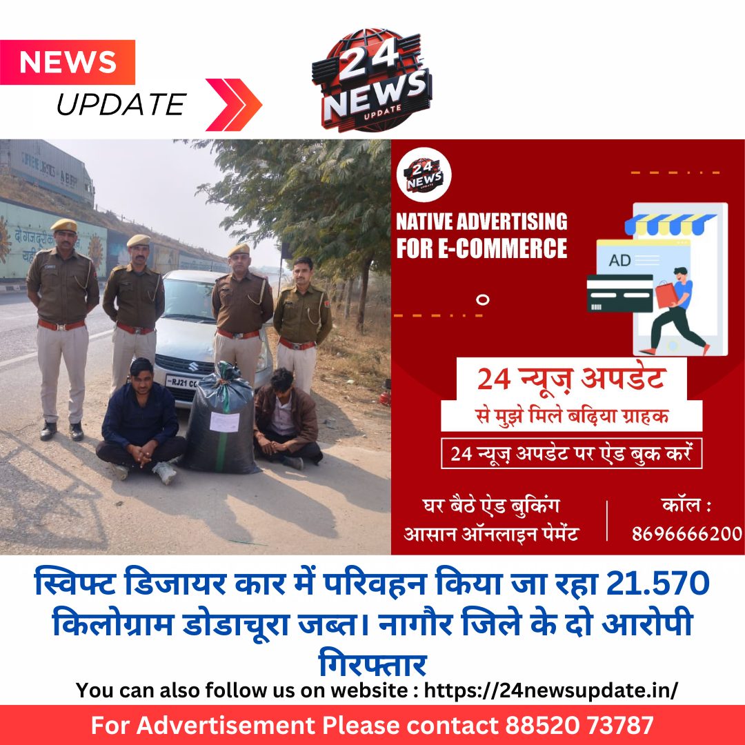24 न्यूज़ अपडेट निम्बाहेडा। जिले की सदर निम्बाहेड़ा थाना पुलिस ने शनिवार को थाना क्षेत्र में गश्त के दौरान एक स्विफ्ट डिजायर कार में अवैध रूप से परिवहन किया जा रहा 21 किलो 570 ग्राम डोडाचूरा जब्त कर नागौर के दो आरोपीयों को गिरफ्तार किया है।