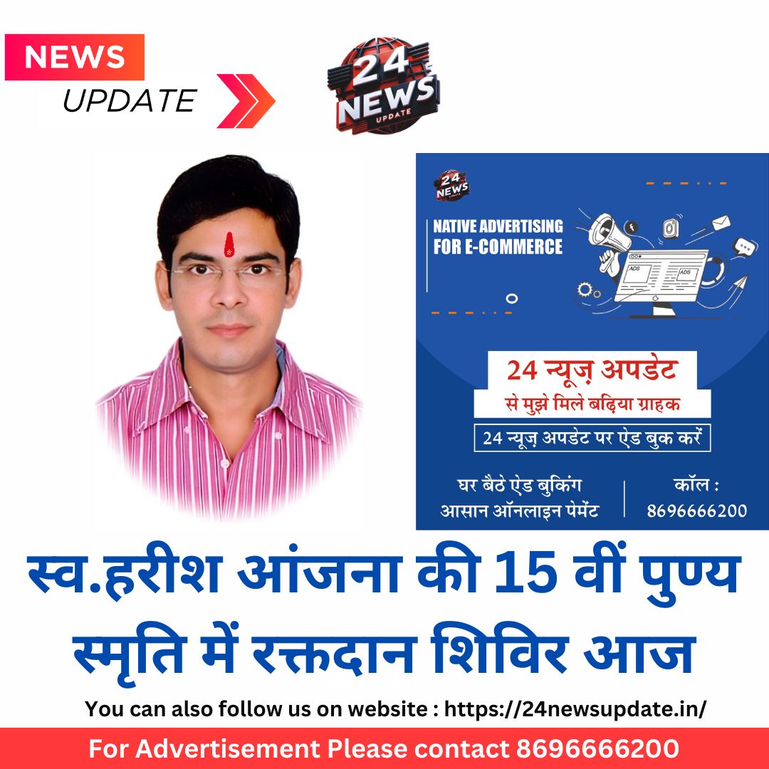 कविता परखा 24 न्यूज़ अपडेट निंबाहेड़ा । हरीश आंजना एजूकेशन सोसायटी, हरीश आंजना फाउंडेशन विकास सेवा संस्थान द्वारा स्वर्गीय श्री हरीश आंजना की 15 वीं पुण्य स्मृति पर एक विशाल रक्तदान शिविर का आयोजन किया जा रहा है। यह शिविर 22 नवंबर शुक्रवार को आज छोटी सादड़ी में भंवर माता मार्ग पर स्थित उदय निवास परिसर पर सुबह 9 बजे से शुरू होगा जो सांय तक चलेगा। इस रक्तदान शिविर का उद्देश्य मेवाड़ एवं मालवा क्षेत्र के सामाजिक, धार्मिक, राजनीतिक संगठन और स्थानीय युवाओं को एकत्रित करके रक्तदान के प्रति जागरूकता फैलाना है। हरीश आंजना एजूकेशन सोसायटी, हरीश आंजना फाउंडेशन विकास सेवा संस्थान ने मेवाड़ मालवा क्षेत्र की समस्त सामाजिक संस्थाओं, सामाजिक कार्यकर्ताओं, जन प्रतिनिधियों, गणमान्य जनों,युवाओं एवं आम जन से अपील की है कि अधिक से अधिक संख्या में मानव सेवा के हितार्थ इस पुनीत सेवा कार्य में पधार कर अपना योगदान देवे। Share this: Share on X (Opens in new window) X Share on Facebook (Opens in new window) Facebook More Email a link to a friend (Opens in new window) Email Share on WhatsApp (Opens in new window) WhatsApp Like this:Like Loading... Related Discover more from 24 News Update Subscribe to get the latest posts sent to your email. Type your email… Subscribe Post navigation निम्बाहेड़ा विधानसभा की दोनों नगर पालिकाओं में 9 कार्यों के लिए 2 करोड़ की वित्तीय एवं प्रशासनिक स्वीकृति जारी सांसद सीपी जोशी ने कोटा रेल्वे मंडल की बैठक में चित्तौड़गढ़ रेलवे से संबंधित विभिन्न विकास एवं यात्री सुविधाओं के विषयों को रखा। कोटा रेल मंडल क्षेत्र के सांसदो की बैठक में सांसद सीपी जोशी ने महत्वपूर्ण विषय रखें